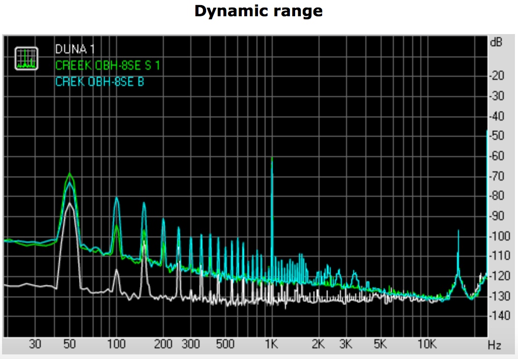Для сравнения я выбрал тест серебристого фонокорректор CREEK. Он получился при сопоставимом уровне тестового сигнала. Все тесты проведены сигналом с медиаплеера.