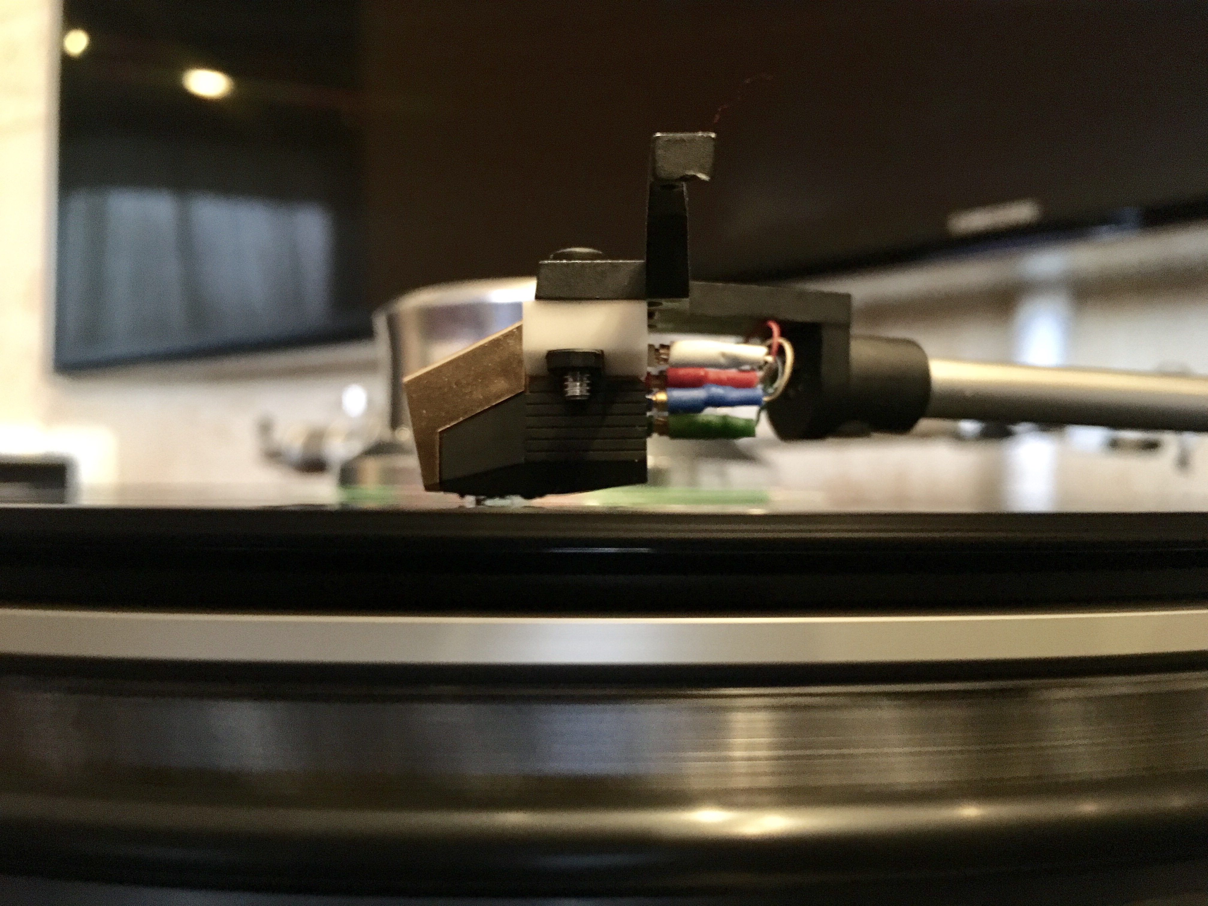 Вчера я произвел несколько пробных настроек и снова остановился на максимально-допустимых значениях. Так звук мне снова показался интереснее и сочнее. Однако меня напрягал один момент, который я пока не могу объяснить. При том же значении прижимной силы, при таком же строго горизонтальном шелле тонарма, головка висит пугающе близко над поверхностью пластинки.