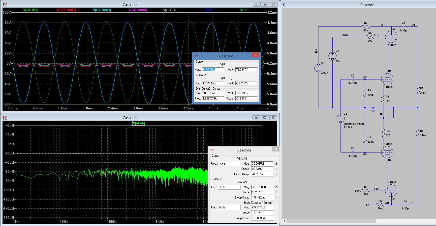 Общие замечания. Номиналы всех пассивных деталей входных и выходных цепей взяты из оригинальной схемы. Я позволил себе лишь увеличить выходные конденсаторы с 0,22мкФ до 0,33мкФ, поскольку нагрузкой для каскадов будет являться не резистор 1М, как по схеме, а резистор 220к, что является максимальным значением для сеточных резисторов применяемых в выходном каскаде мощных ламп. В реальности, просто необходимо увеличить входные конденсаторы хотя бы до 0,33мкФ, а выходные - примерно до 0,47 - 1 мкФ. Как правило, на эпюрах напряжений в левой верхней части вставленных рисунков отражены напряжения сетка-катод (чтобы быть уверенными, что они не выходят в положительную область), ток анода (на одном из анодных сопротивлений - чтобы исключить клиппирование и выход тока за пределы максимально допустимого), выходное напряжение. В левом нижнем углу показано быстрое преобразование Фурье, для оценки чистоты спектра. КНИ я определял по доминирующей гармонике, однако, нужно смотреть и на амплитуду других сравнимых гармоник, чтобы однозначно определить выигрышную с точки зрения нелинейных искажений конфигурацию. Также нужно учитывать, что выходной каскад на лампах, при максимальной выходной мощности, будет иметь КНИ в единицы процентов, поэтому, хоть показатели КНИ драйверного каскада всё равно важны, к ним стоит подходить критически.