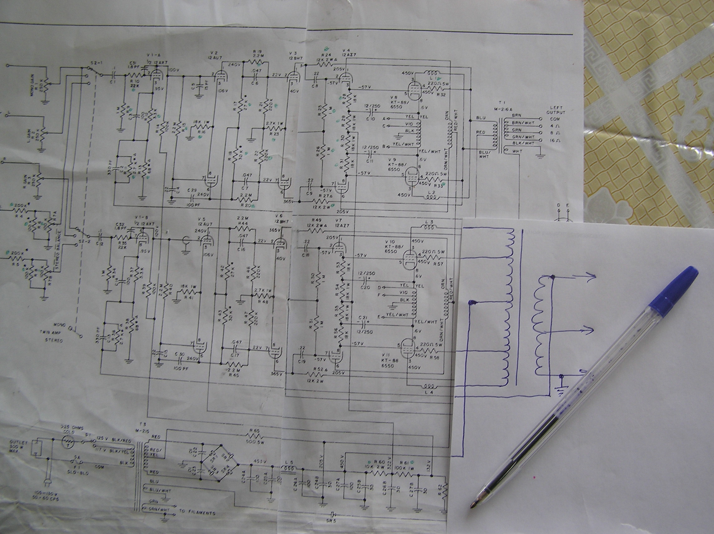 И снова - проблема с накалом. Для ECC88 предельные напряжения составляют 50В, если потенциал накала выше потенциала катода, и 150В, при других параметрах. Разность между катодами нижней и верхней лампы составляет 355-9=346В (напряжение между катодами изменяется незначительно), поэтому (150В для ECC88 + 100В для 12BH7=250В) невозможно подобрать смещение для общего накала и придётся запитывать накалы ECC88 от отдельной обмотки/блока питания с соответствующим "подъёмом".