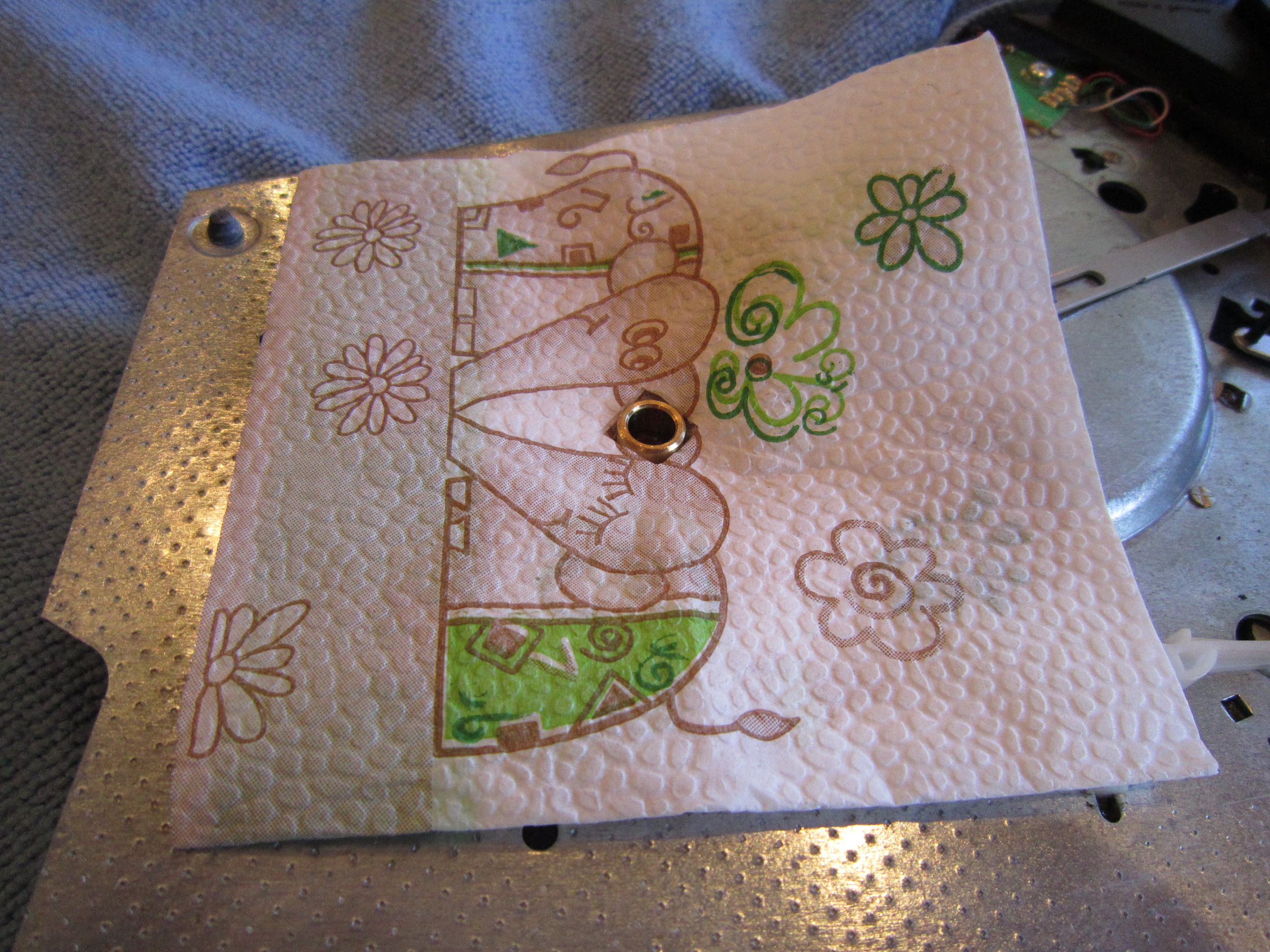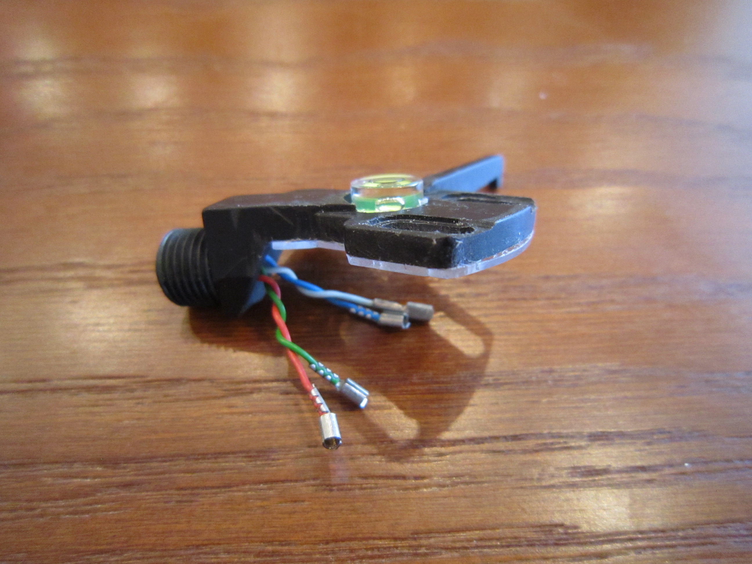 Получалось, что пластинка находится слишком низко. Я с этим уже сталкивался (viewtopic.php?p=862#p862). Исправляется увеличением толщины мата, но новый мат я заказал такой же - 3 мм. Или прокладкой между картриджем и шеллом. Ее я и вырезал из крышки от компакт диска.