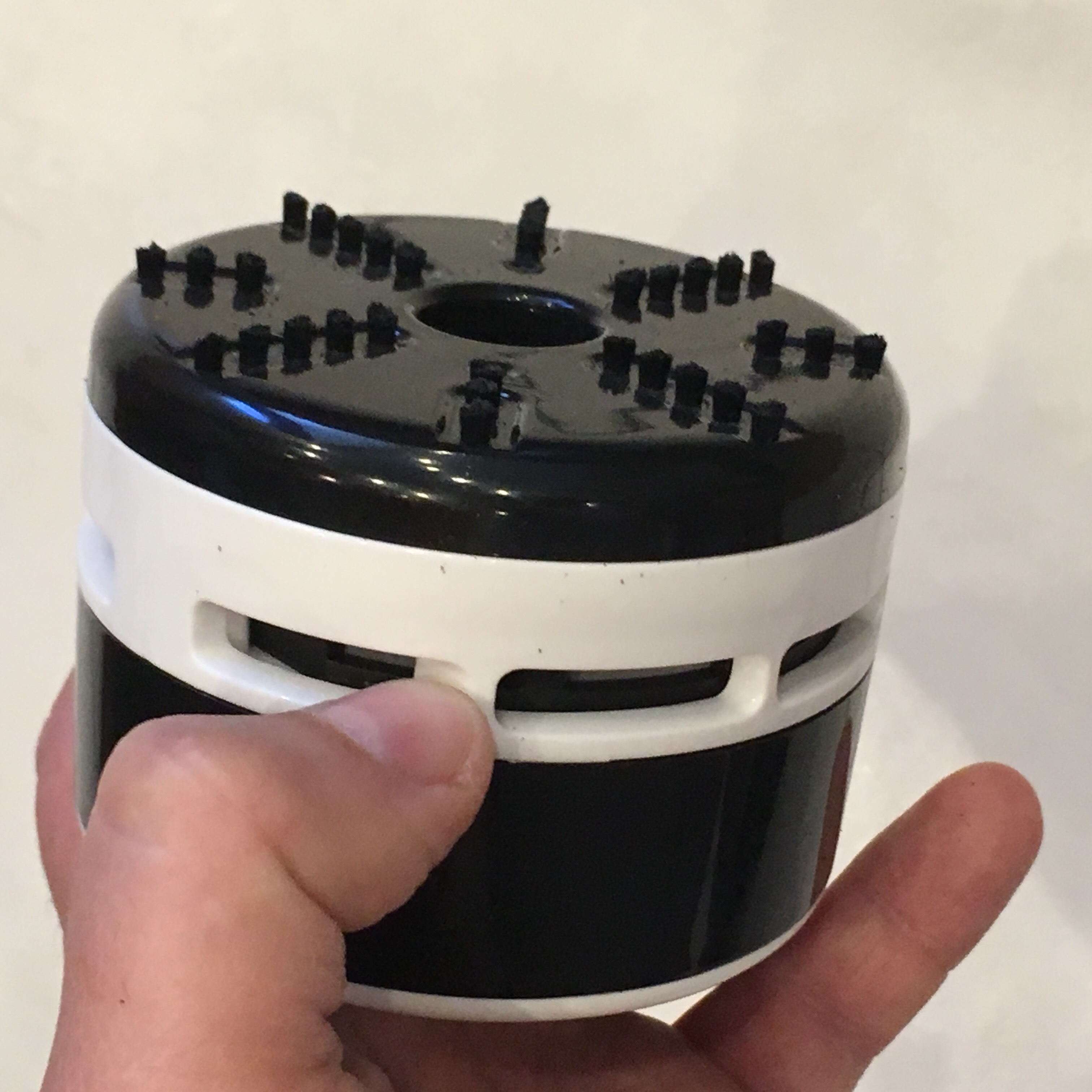 Рассчитывал, что уменьшив зазор над поверхностью, увеличу силу всасывания. Не помогло. Жаль, уж больно удобно было бы. И по диаметру он как раз на ширину дорожек встает. Щетина только жестковата. Но, не царапет (провел испытания).