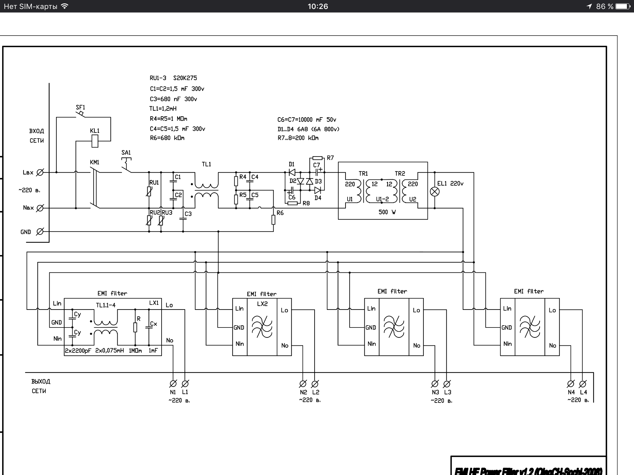 - Приведённая схема рассчитана, насколько я понял, на применение в качестве внешнего фильтра типа "Пилот". Я это пишу потому, что Вы хотите вставить эти фильтры внутрь устройства, чтобы до конца понять конструктив. Внутри корпуса нужно будет защищаться от электромагнитных полей дросселей, если, конечно, не применять тороидальные трансы и дроссели (или на крайний случай - с закрытым магнитным потоком).