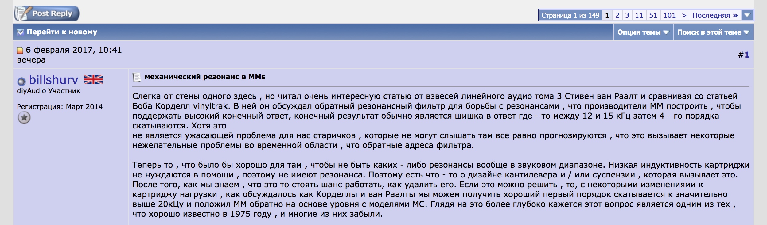 Примерно я нащупал, что речь идет о свойственном для ММ-картриджей резонансе и способах его борьбы с ним. Я никогда ничего подобного не встречал, даже в косвенных упоминаниях. Однако сейчас я сам лично наслаждаюсь большей прозрачностью и отчетливостью МС.