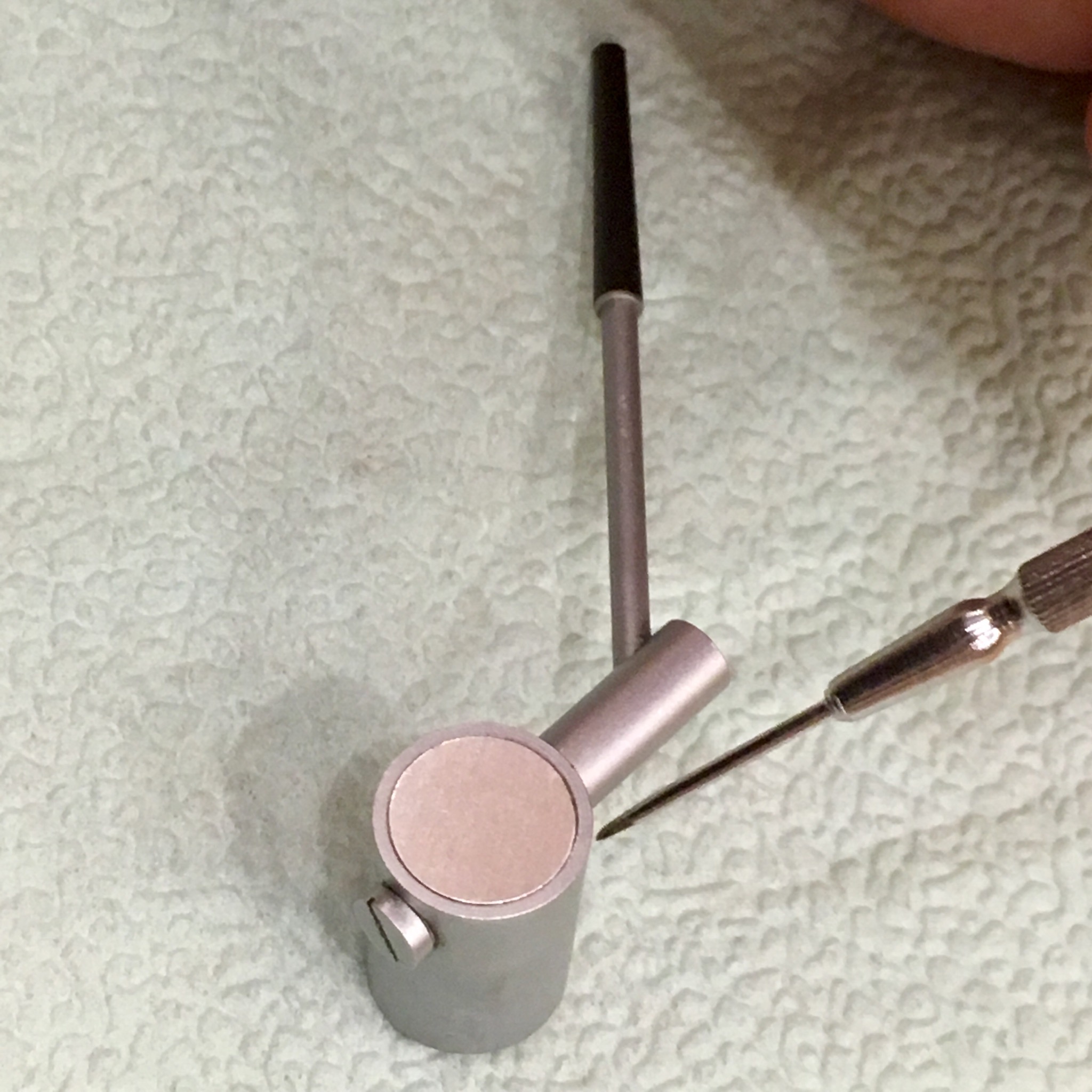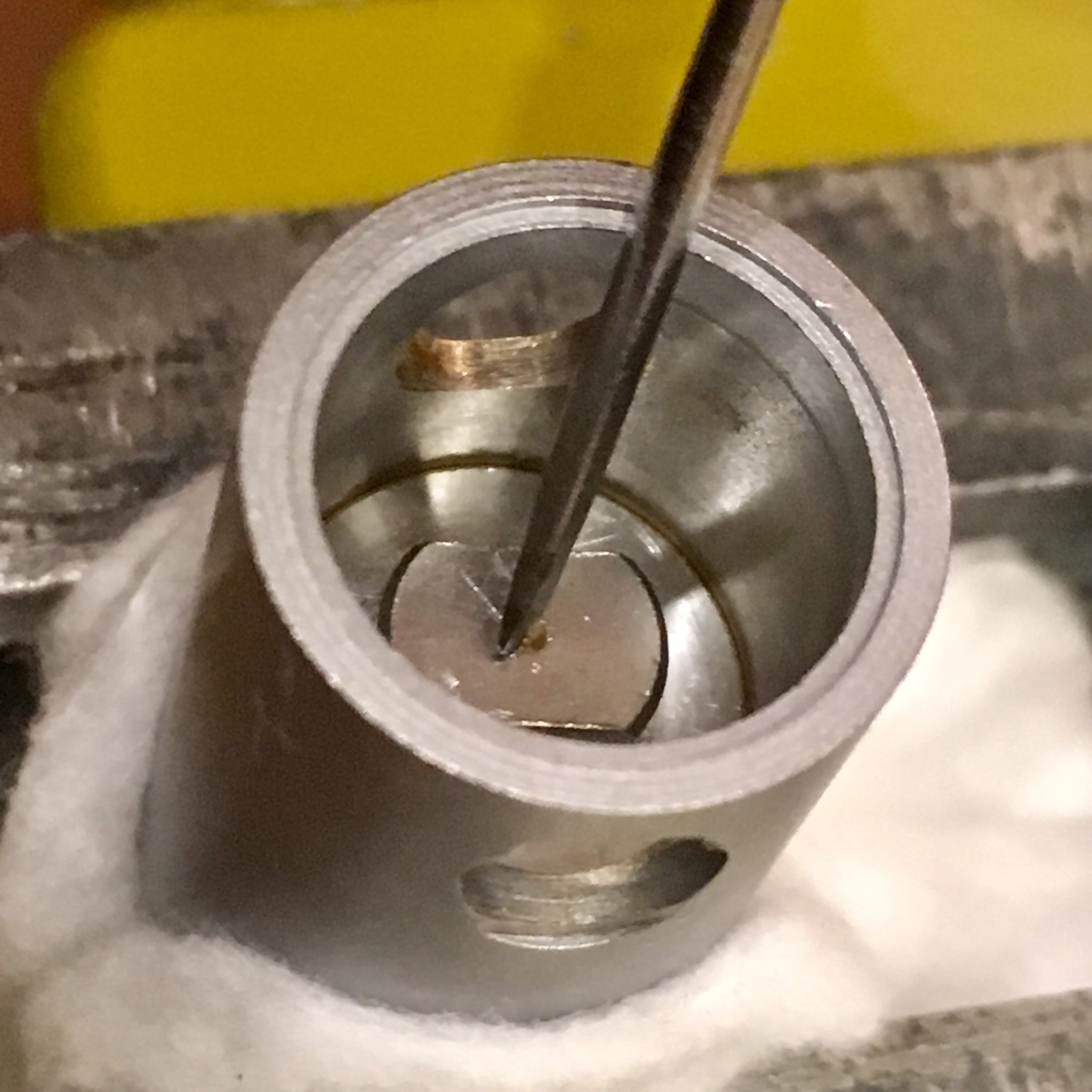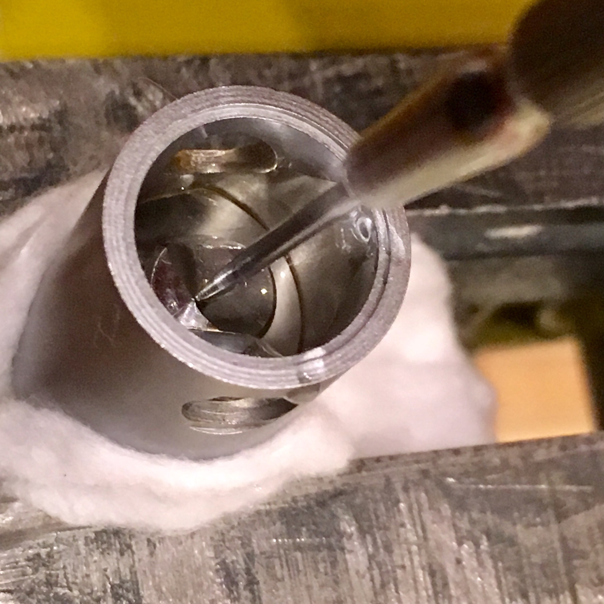 7) Вставляю на место поршень с пружинкой. Прижимая отверткой, наполняю новой вязкой смазкой (я использую ту, что у меня есть). Буквально пять капель.