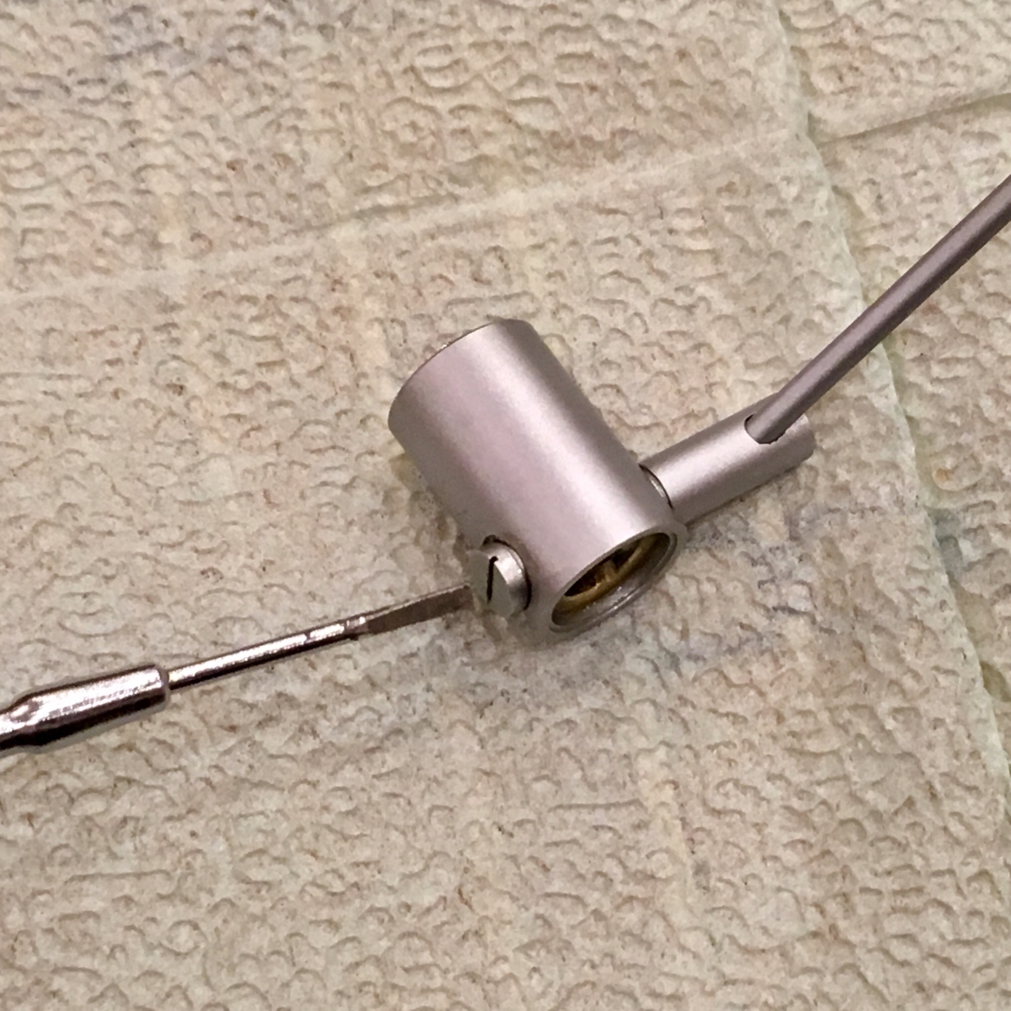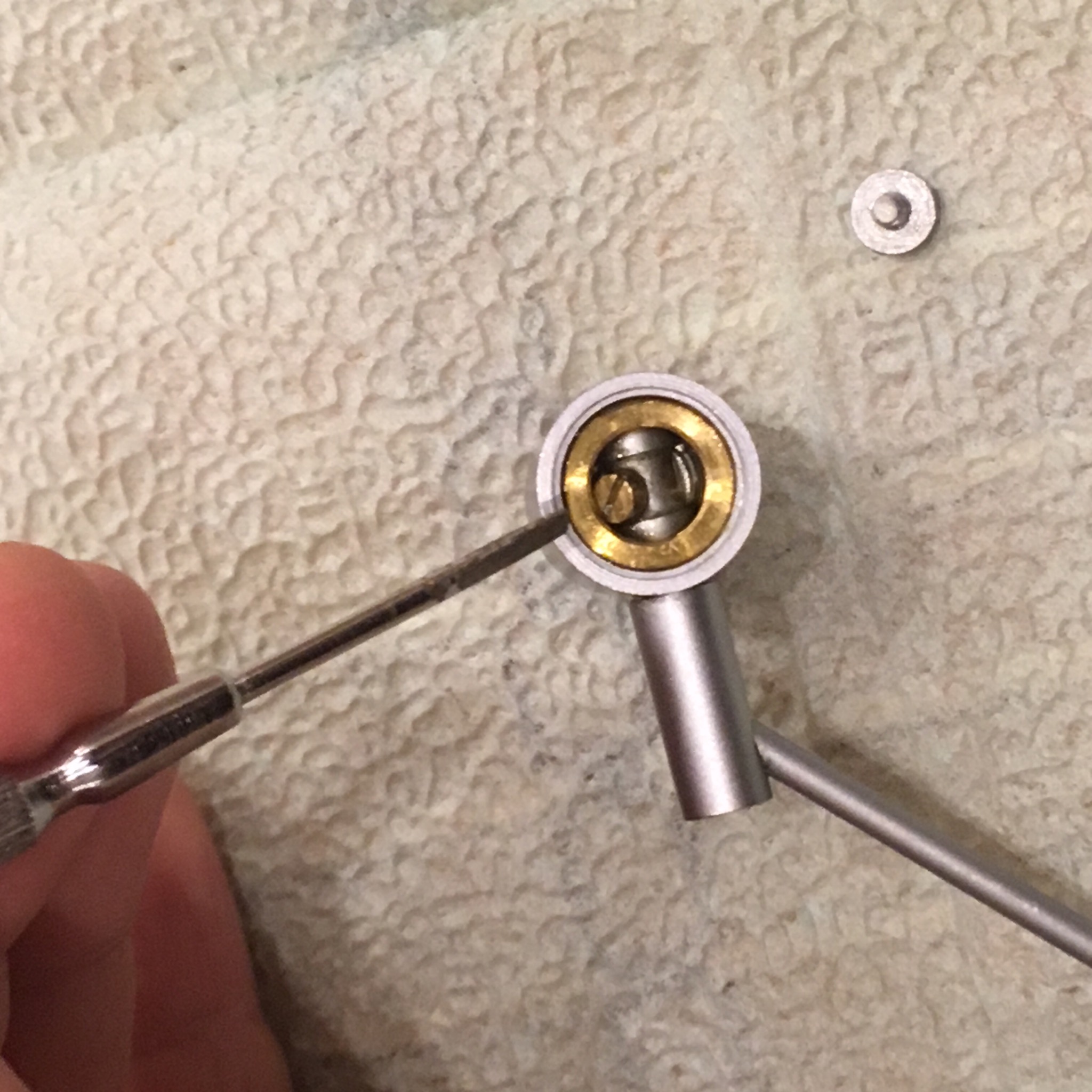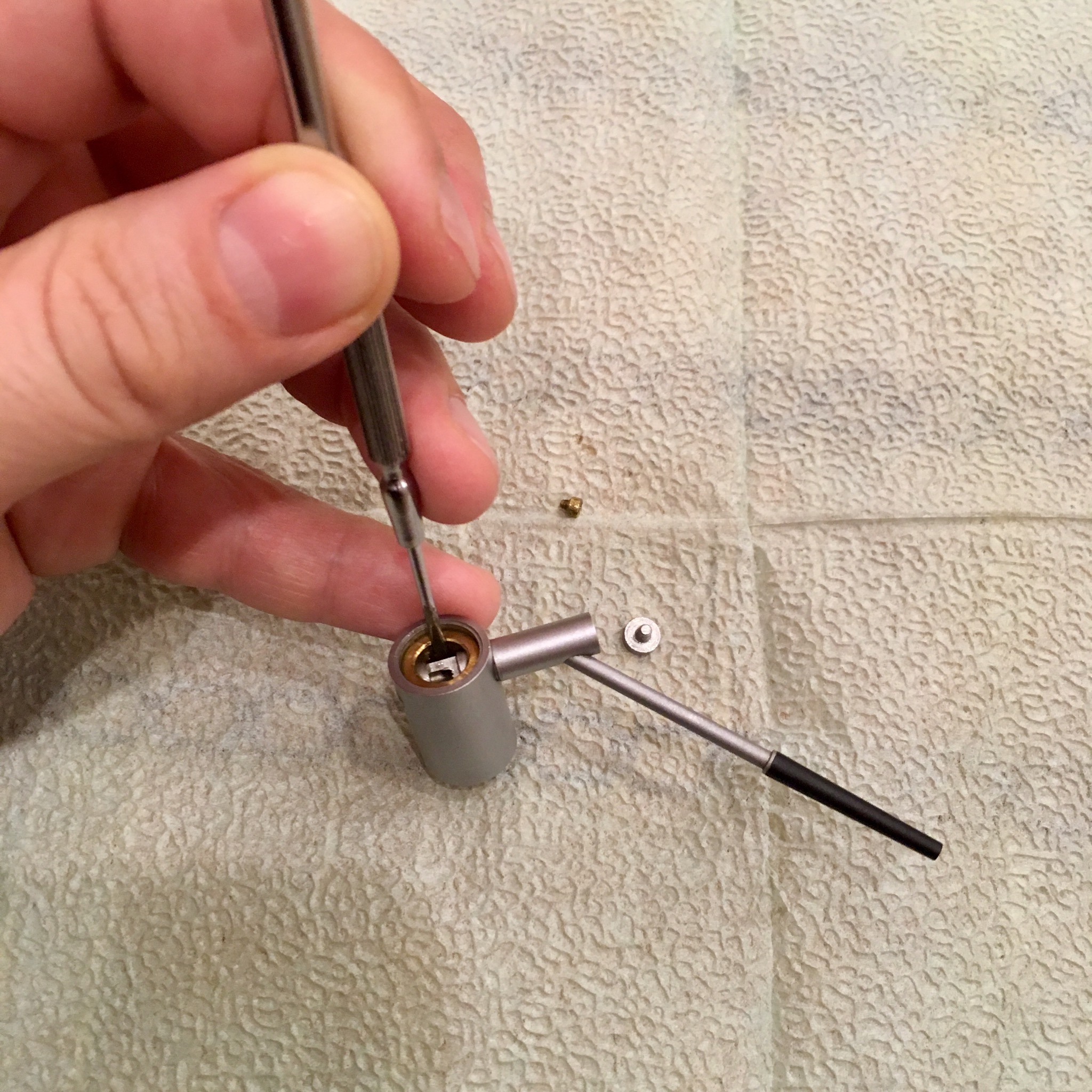 Нужно отвернуть и внутренний винт. После чего, опустив тонкой отверткой поршень вниз, извлечь рычаг с валом.