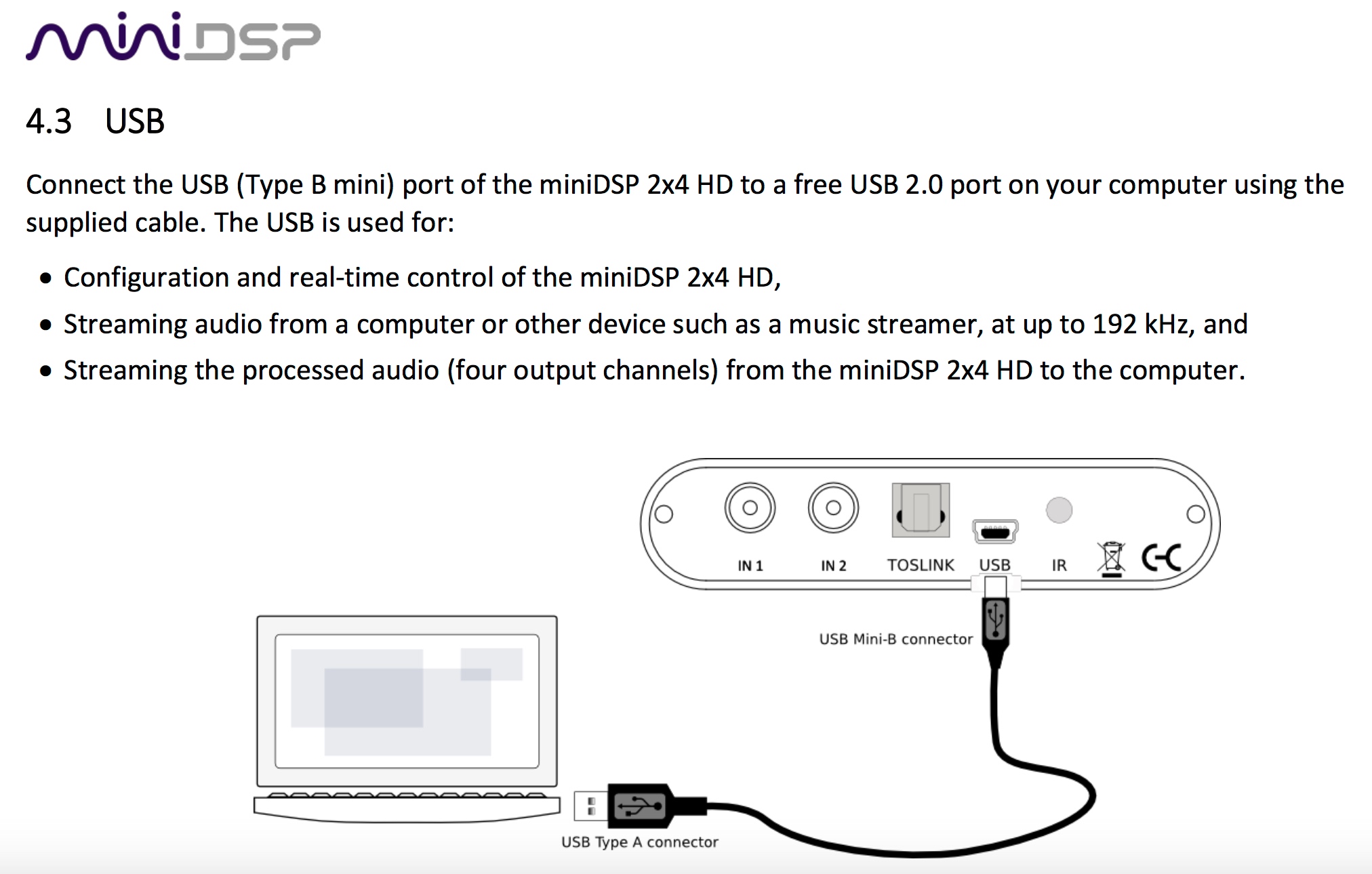 "The USB input cannot be used for sending audio into the miniDSP unit. It is used for control and configuration only. To add USB streaming to a miniDSP product, use a miniStreamer or USBStreamer."