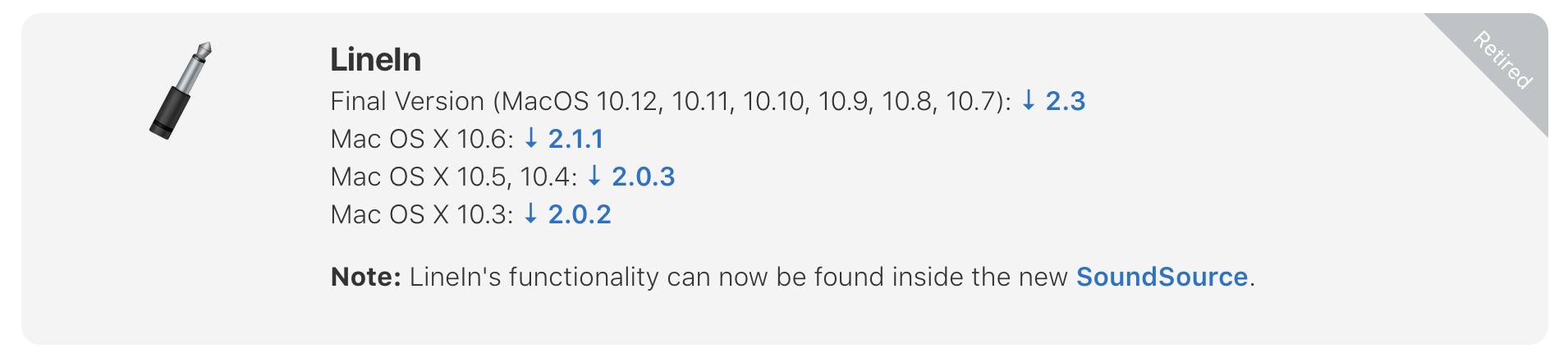 По ссылке заметка, что LineIn больше не поддерживается и что нужно скачать новую версию в составе пакета Sound Source. А ниже- что можно скачать старую версию.