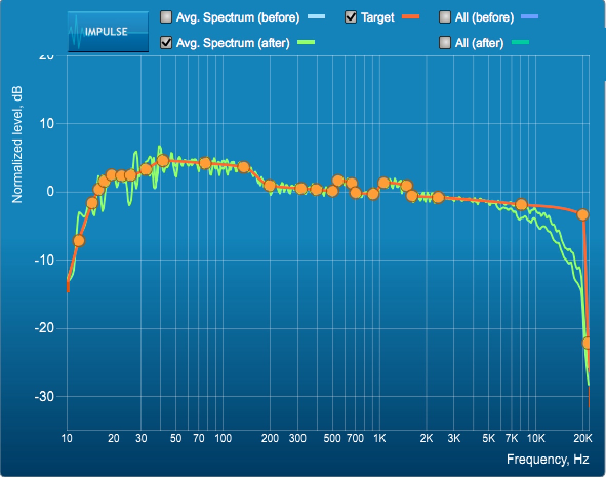 1) В DIRAC строю фильтр FLAT, предполагающий максимально доступную итоговую АЧХ. Некоторые точки на целевой кривой приходится (экспериментальным путем) добавлять и удалять, в зависимости от появляющихся резких пиков/провалов.