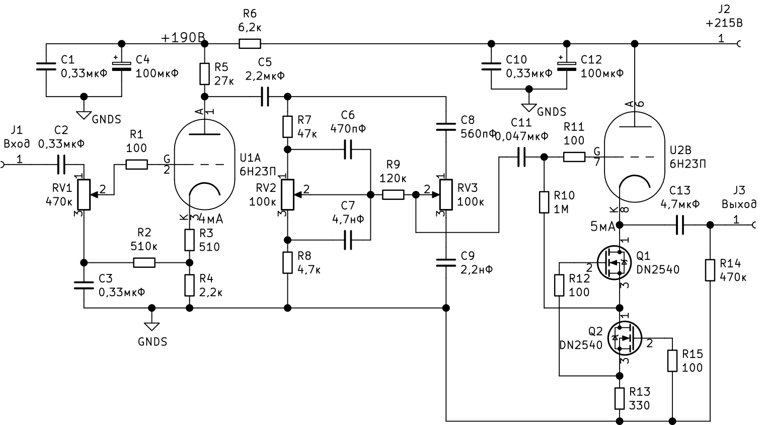 Итак, Я нарисовал две схемы: повторение оригинальной с пересчитанными сопротивлениями и с источником тока на DN2540. На лампах рисовать не стал. Перед тем, как выложить эти рассчитанные параметры сюда я попытался отмоделировать это в LTSpice. Выяснилось, что параметры темброблока резко изменяются при уменьшении сопротивления нагрузки. В варианте DN2540 это легко исправимо (каскодная схема, можно разбить потенциалы и обеспечить комфортные 5В для верхнего транзистора). В ламповом варианте 5В - это крайне мало, каскода нет, способ внешнего смещения не даёт такого большого входного импеданса. Короче, схему с лампами нарисую чуть позже.