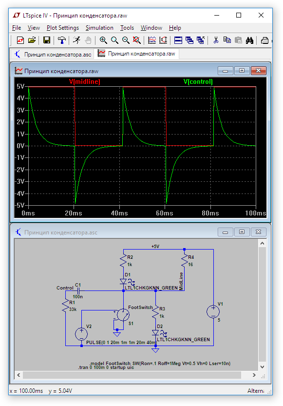 Примерно на 20мс мы нажимаем на педаль. Правая обкладка C1 притягивается к земле, левая обкладка остаётся на верхнем конце R1. Это эквивалентно подключению источника питания положительным полюсом к земле, отрицательным - к точке Control. Через R1 возникает ток обратной полярности, который разряжает конденсатор, напряжение на нём падает. Когда конденсатор разрядится, напряжение на нём станет снова равным нулю.