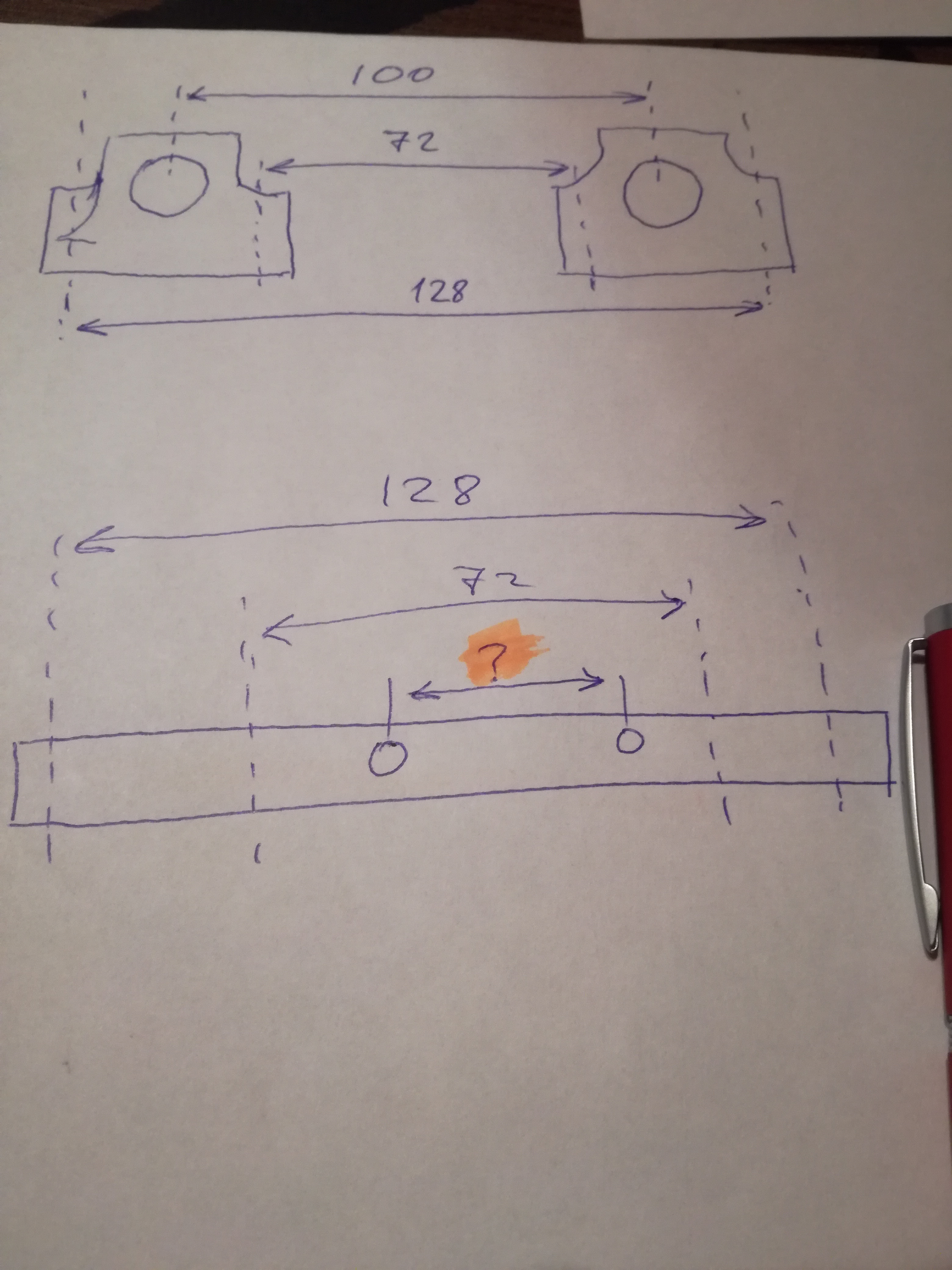Таким образом, если направляющие друг от друга на 100мм, то между двумя соседними отверстиями 72 мм, между дальними - 128. Следующая деталь(3) - сейчас выполнена у меня из алюминиевого профиля - некая перекладина 140 мм, к которой сверху я креплю пластину.