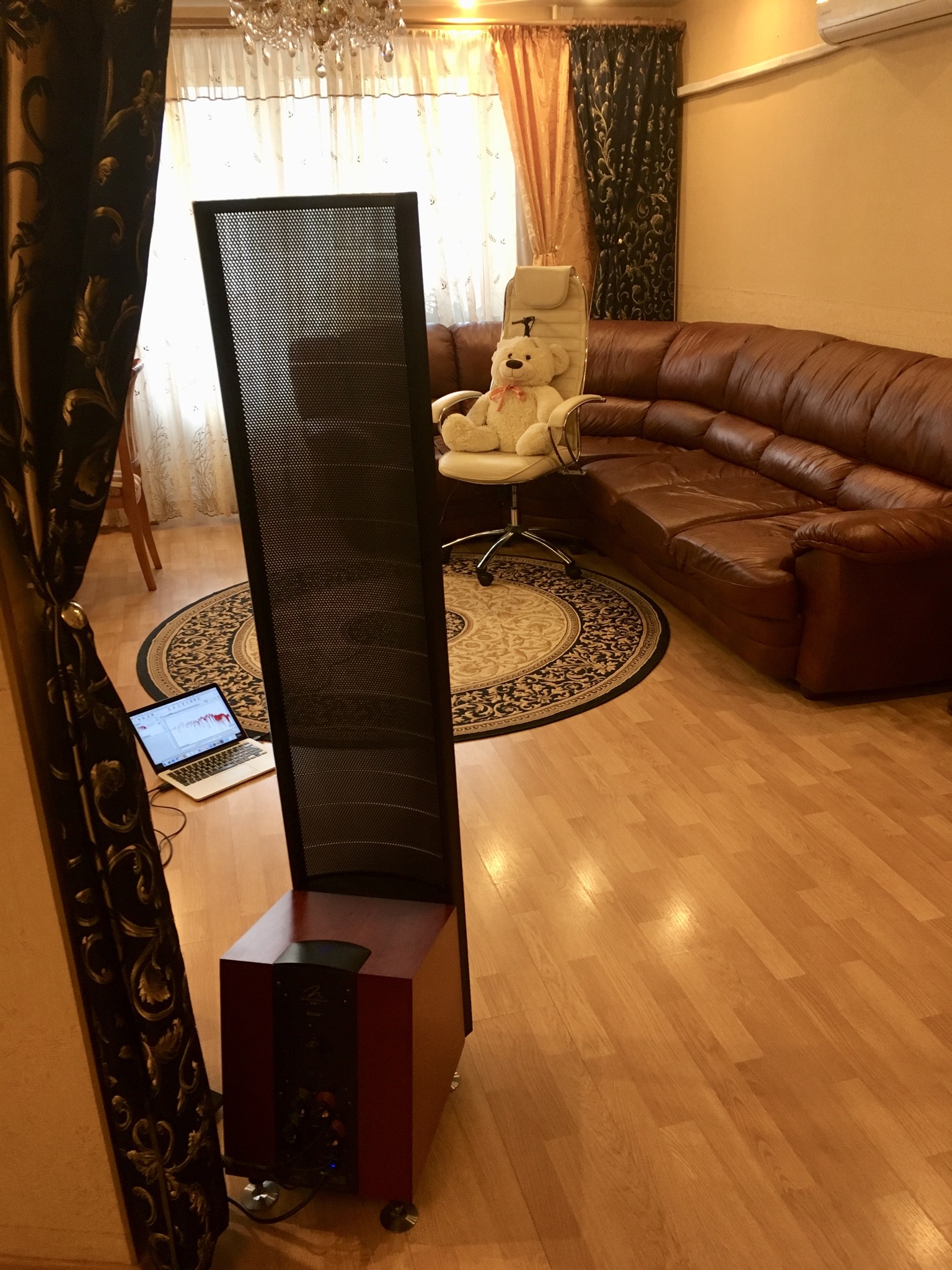 Я уже показывал рисунок моей расстановки в комнате: Эти электростаты у меня уже два месяца. Естественно, я вдоволь наигрался с их установкой. Двигал, крутил, наклонял и выравнивал. В итоге они встали параллельно друг другу. Т.е. без малейшего разворота в сторону слушателя. При этом, "тест фонариком" получается просто идеально.