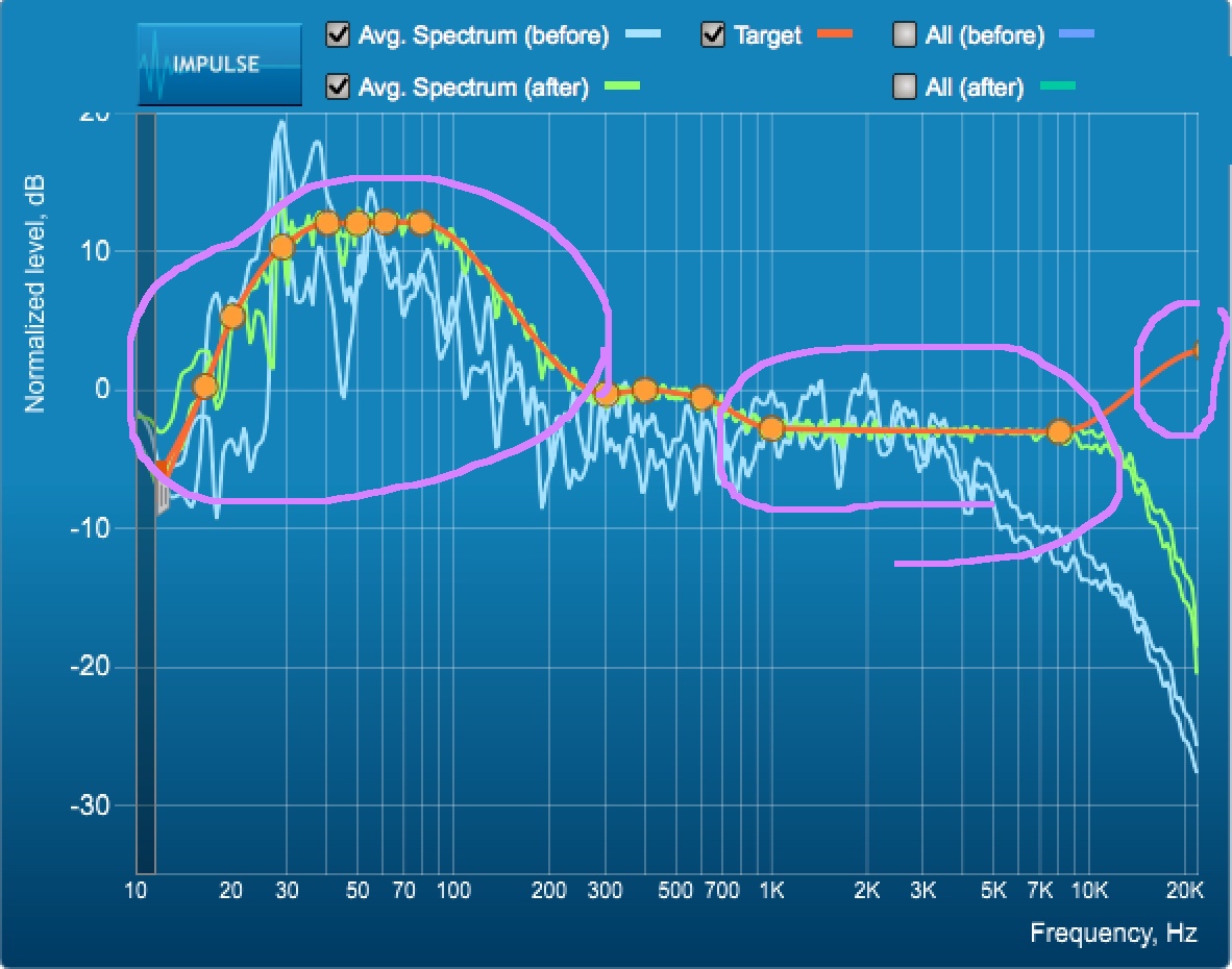 1) В DIRAC строю фильтр FLAT, предполагающий максимально доступную итоговую АЧХ. Некоторые точки на целевой кривой приходится (экспериментальным путем) добавлять и удалять, в зависимости от появляющихся резких пиков/провалов.