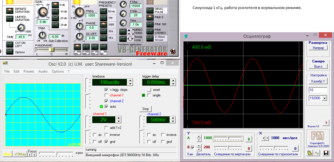 Осциллограф у меня не настоящий :) программы на ПК, щуп самодельный (пока не заработал на добротный осциллограф). Ниже я выложу все скриншоты. "Загасить" возбуждение увеличением емкости в ООС не удалось, если очень сильно увеличить емкость то возбуждение исчезает, но появляется большая постоянка на выходе. Установкой джампера (на схеме выше) я случайно заметил, что возбуждение исчезает. На плате конечно я его предусмотрел заранее, потому как и сам автор рекомендует его при замене ОУ.