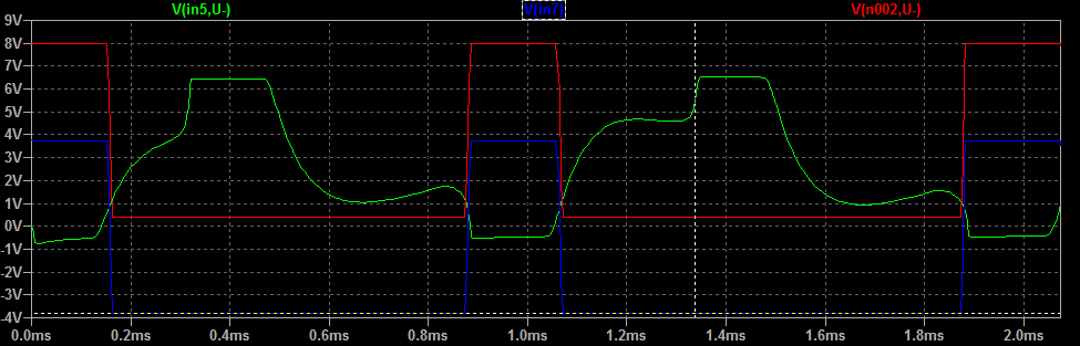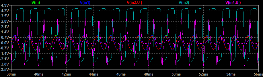 Что я имею в виду? Мы понимаем, что амплитуда сигнала на выходе не может быть больше напряжений питания шин. В нашем случае они - 4,5В. Имея в виду, что ОУ имеет хоть небольшое, но усиление (применяем делитель с ненулевым R2), а на входе - сигнал уже приближающийся к 4,5В (на практике, скорее всего, практически равный), мы получим такое же "обрезание верхушек", как и в предыдущем каскаде. Этому помогают D1D2, которые ограничивают амплитуду выходного сигнала напряжениями шин питания с учётом прямого падения напряжения на диодах. In5 - вариант переключателя GRUNT в нижнем положении, In6 - в верхнем. Я немного схитрил, чтобы показать различия - добавил небольшой ток утечки на отрицательную шину, на практике отличия будут несколько меньше. Также эта утечка сместила сигнал вниз, так что не пугайтесь установленных значений.