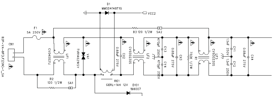 У нас это построено так: Y-конденсаторы, предохранитель, варистор, NTC, разрядник, X-конденсатор, синфазный фильтр, Y-конденсаторы, дроссели, X-конденсатор, синфазный фильтр, X-конденсатор. (Условная формула: YFVNRXSYLXSX) Я считаю, что наш фильтр лучше, так как в телевизионном фильтре отсутствует проходной дроссель. Если убрать несущественные элементы, не относящиеся к фильтрации (предназначенные для безопасности) и перевернуть "телевизионную формулу", то получим:
