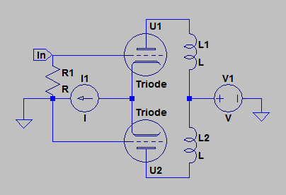 L1, L2 представляют собой встречно включенные обмотки выходного трансформатора. I1 - это снова источник тока. В данном случае, если мы говорим об идеальных лампах, его можно просто убрать (закоротить) и ничего не произойдёт, каскад будет работать ровно так же. Но лампы - неидеальны, поэтому, скажем, крутизна процесса открывания лампы отличается от крутизны закрывания (поясняю: допустим, я увеличил напряжение на сетке лампы на 1В, при этом ток изменился, допустим, на 10мА; если я уменьшу напряжение на сетке на 1В, ток может измениться (в другую сторону) на 9мА). Суммы токов получаются неравными и здесь вступает в действие источник тока. Он выравнивает эти изменения таким образом, чтобы они происходили исключительно симметрично (например, из примера выше - обе лампы изменят ток через них на 9,5мА, только в разные стороны)! Эффективность этого настолько высока, что второй источник сигнала (допустим, In-) можно просто убрать и закоротить сетку лампы на землю: