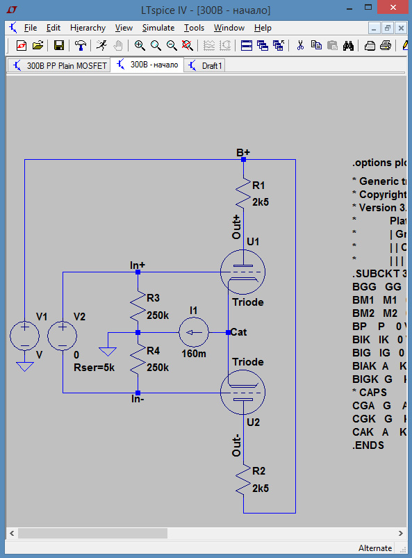 Настало время создать компьютерную модель нашего усилителя. Несмотря на то, что в LTSpice можно работать и с трансформаторами, во избежание сложностей в понимании происходящих процессов и зависимости от применённых в результате трансформаторов, я решил создать эквивалентную схему, в которой первичные обмотки трансформаторов будут представлены чистыми сопротивлениями. Так как, в отличие от трансформаторов, реальное значение сопротивления одинаково для постоянного и переменного тока, значение напряжения B+ будут казаться запредельными, но это только до той поры, пока мы не заменим всё это на реальные детали.
