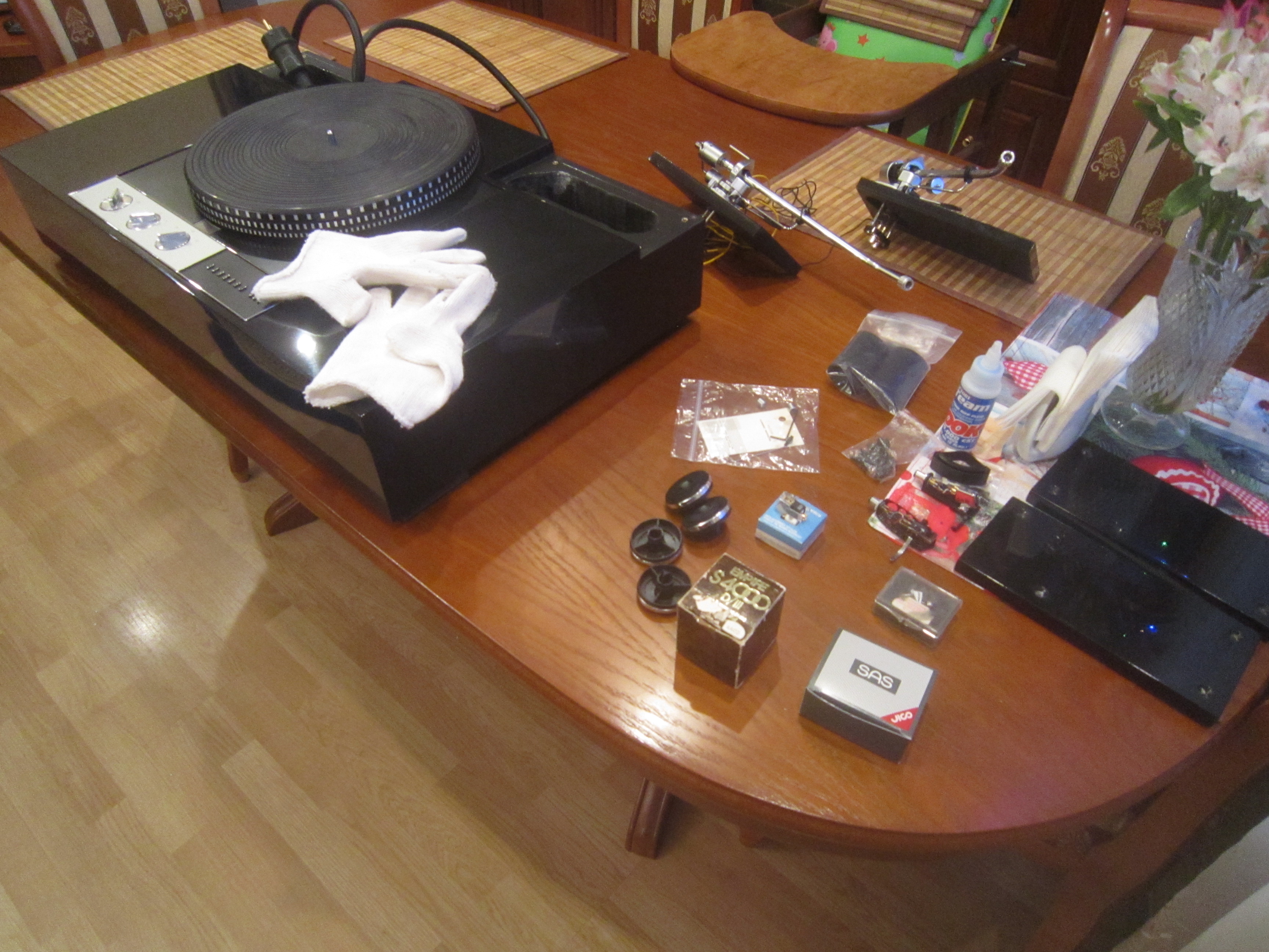 Но, просто распаковать и включить не получается. Нужно собрать и настроить. И ножки какие-нибудь сделать. Думаю, пока приспособить штатные от моего DUAL. Временно. Да и место установки нужно подготовить. Перестроить все на нем. Телевизор перевесить. Куча мороки, до Нового года не успеть... Пока проигрыватель поселился в кабинете. Буду собирать и настраивать.