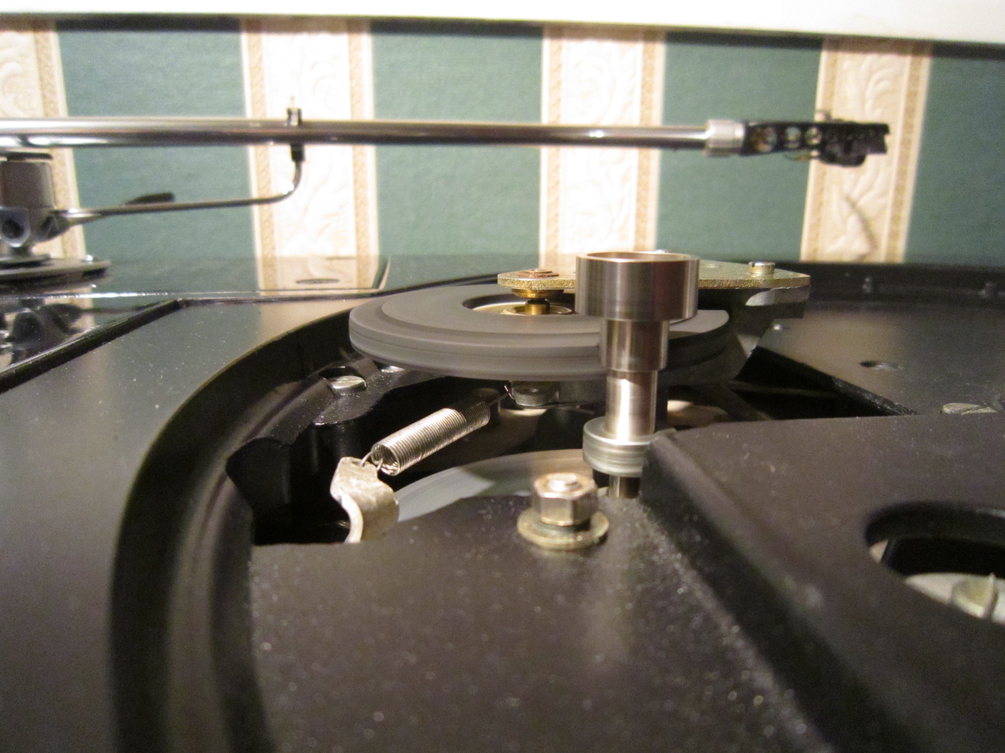 Блин, это меня конкретно разозлило!!! О таких вещах предупреждать нужно. Винты оказались без стопоров. Я пока крутил, один открутил совсем. Внизу железяка повисла и начала дребезжать. И вот я один, полпервого ночи, держа одной рукой тяжеленный проигрыватель, второй накручивал винт и удерживал пружинку...
