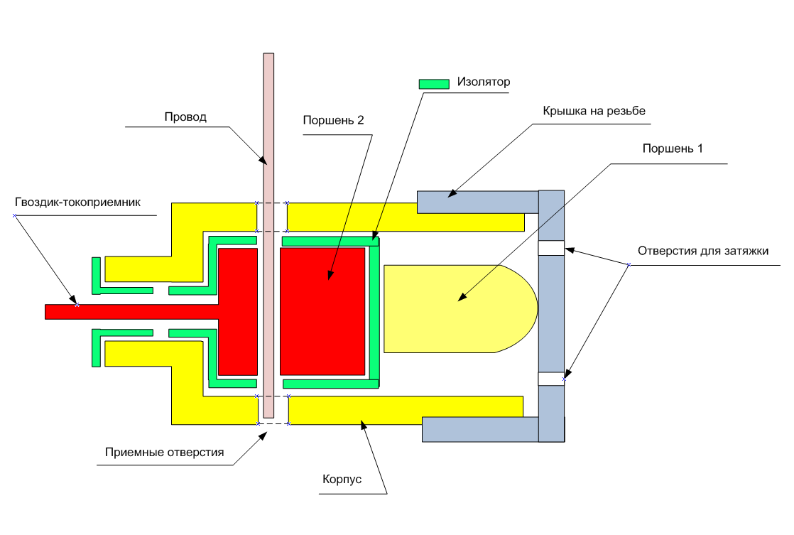 Итак, берём медный гвоздик, подкладываем под шляпку изоляционную шайбу, вставляем его в изолирующую трубку. Всю конструкцию устанавливаем в цилиндр с одним просверленным дном. Цилиндр закрепляем на корпусе, допустим, гайкой. К ножке гвоздика паяем провод. С другой стороны цилиндра вкладываем медный поршень, с изолированными стенками (как в старых шприцах) и винтом по внутренней резьбе цилиндра его зажимаем. Между поршнем и шляпкой гвоздика вкладываем провод. Т.о. провод будет зажат между двумя медными поверхностями, к одной из которых припаяно соединение. Изоляция медных частей позволяет не заботиться об изоляции от корпуса и о всяких электрохимических парах, при желании, можно покрыть серебром/золотом шляпку и торец поршня.