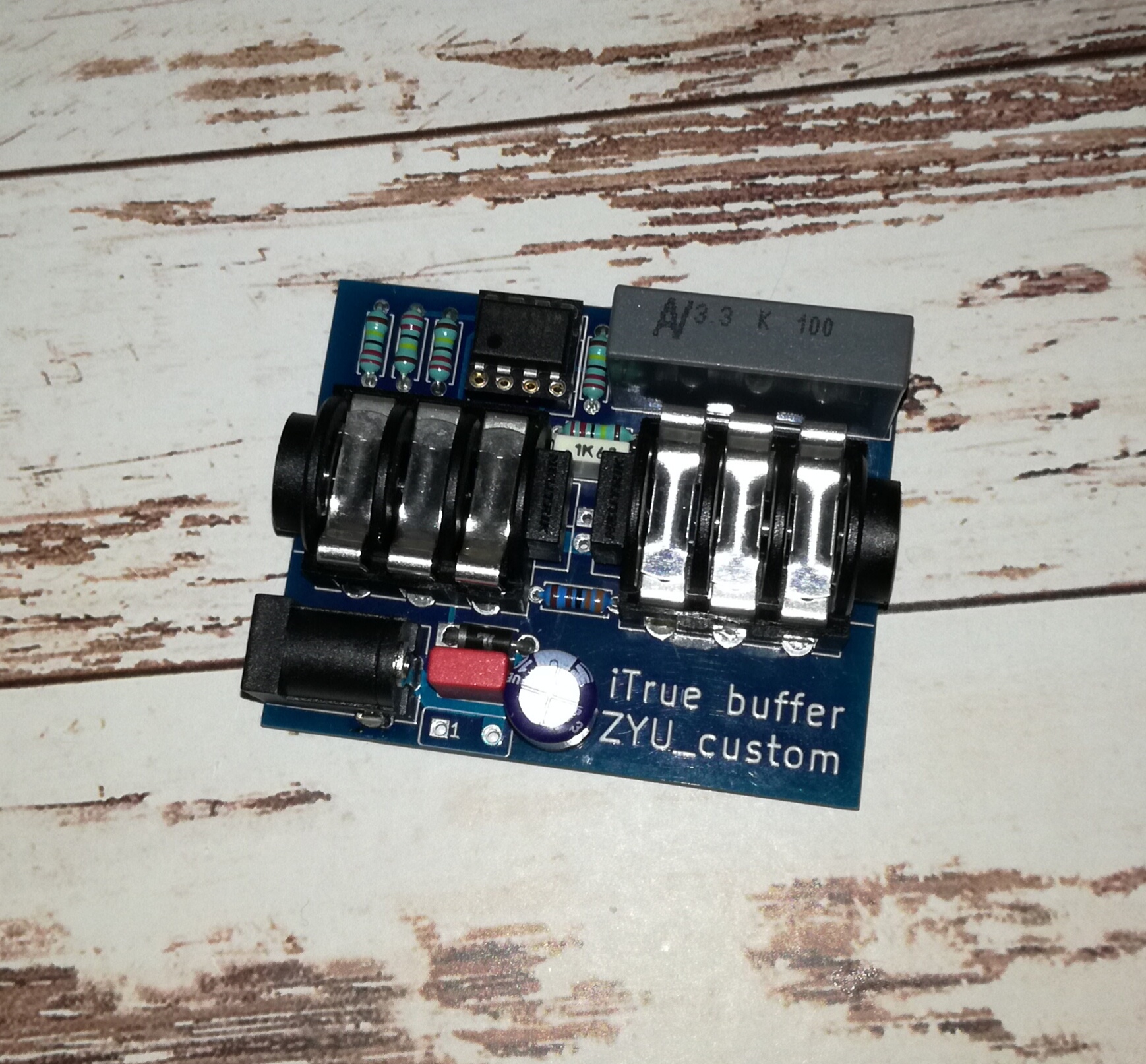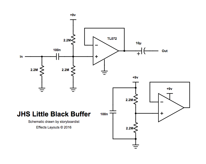 Вот возьмём этот буфер. Я сильно не уверен, что 9В питания хватит для того, чтобы не обрезать верхушки особо громких сигналов (с учётом того, что измеренный номинал RMS при обычной игре равен примерно 1В). А это несколько подрывает способность "ответвить" "чистый" сигнал для дальнейшей обработки.