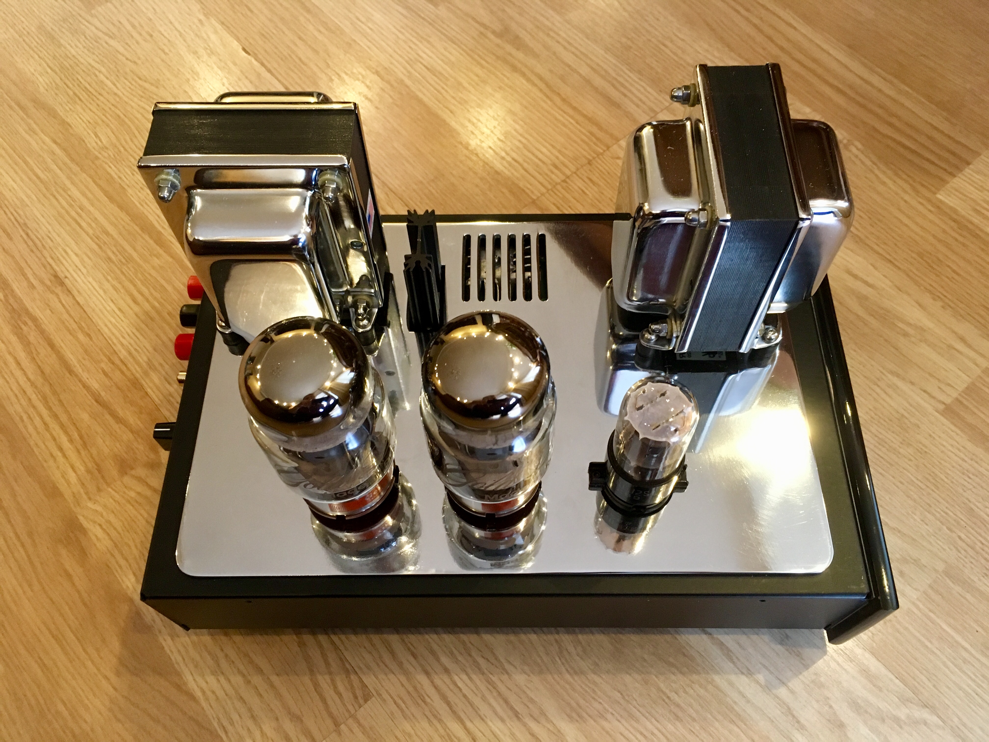 У меня была мысль - решить вопрос кардинально. Весь крепеж заменить на черный. У ламповых панелек он уже такой. А винты, гайки, гравера для трансформаторов купить заново. И покрасить (из баллончика) уголки и проставки в черный цвет.