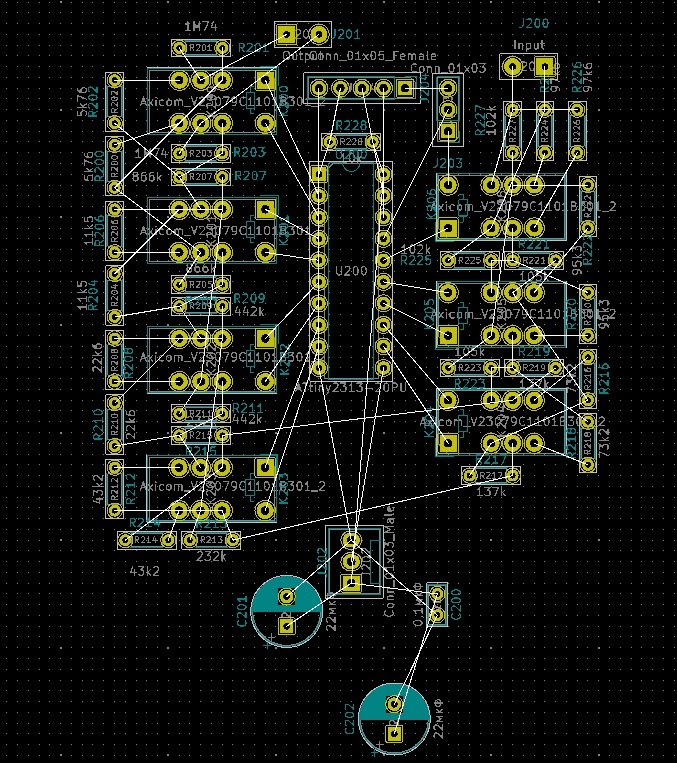 и в принципе решает все вышеперечисленные проблемы ценой удвоения количества реле и сопротивлений. Для усиления "балансности" можно исключить соединение с землёй "параллельных резисторов" R3, R4 в точке "А" и заменить их на один. Это сэкономит нам также один контакт реле. Мне сложно оценить влияние наводок от разных цепей управления реле на результирующую конструкцию в данном упрощении. Хочу отметить, что "упрощённый" вариант является классическим четырёхполюсником, в некоторых публикациях он называется О-ячейкой. Наихудшая точность входного сопротивления для резисторов ряда E96 может составлять до 2%, точность аттенюации - 2%. Точность аттенюации нас не очень волнует, а вот точность входного сопротивления может сослужить плохую службу, в связи с тем, что она неравномерно распределена по балансным линиям.