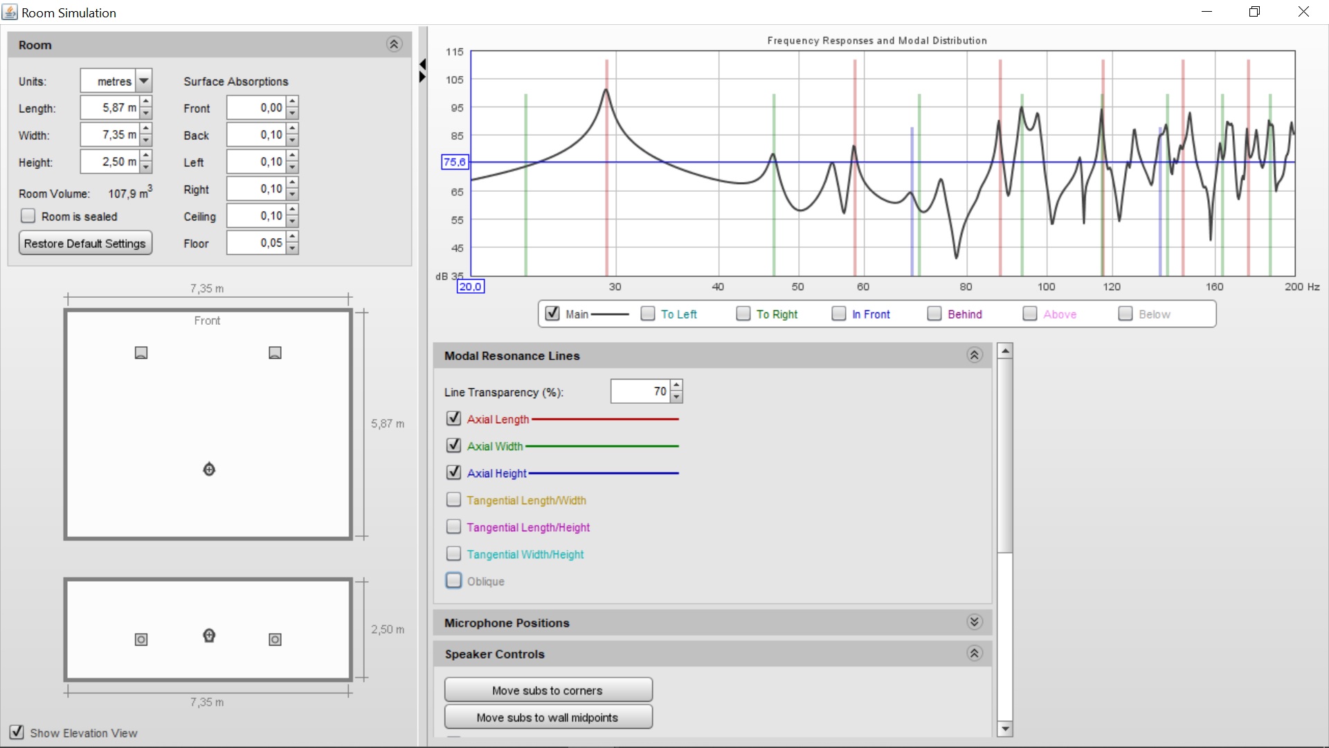 Например, я вижу совпадение мод на 69Гц. и на 70Гц. по осевой линии комнаты, где возможно будет располагаться голова слушателя. Диван еще не приехал и пока, я могу только предполагать, какая получится высота посадки...