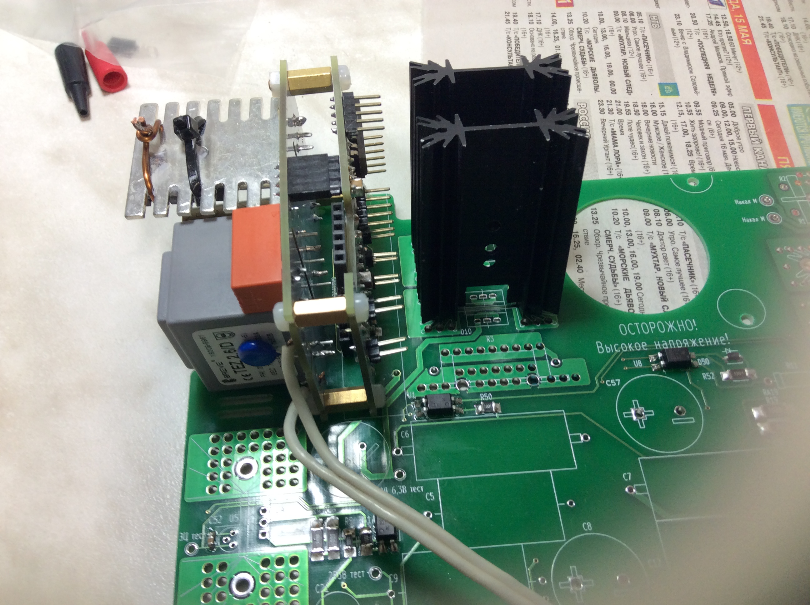 Я бы пошёл по стопам Яна: сначала собрал блок питания (силовую плату), проверил наличие, величину и стабильность напряжения (pin 3 и 4 разъёма J5), Потом попробовал бы включить с помощью этого напряжения реле (подать плюс питания с pin 3 на pin 2 и pin 1). Одновременно должны загореться светодиоды соответствующих реле. Если всё работает, то силовая плата готова