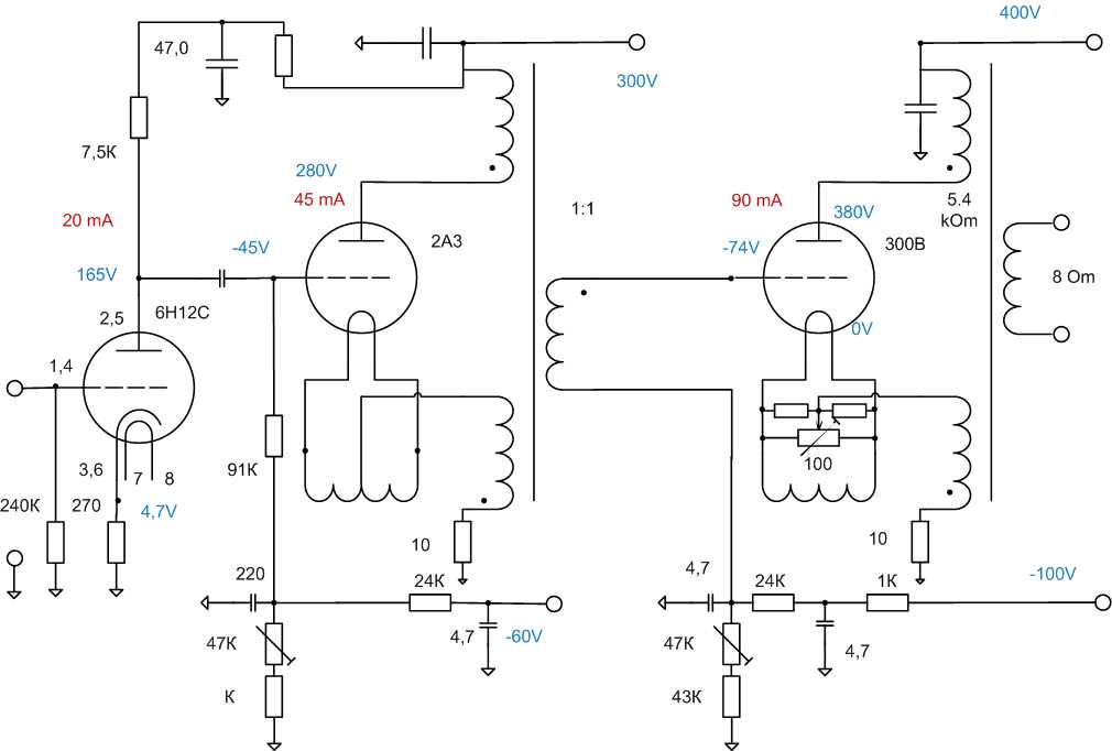 Пентоды отброшены сразу – ну не нравится мне их звучание, значит триоды. Есть опыт прослушки усилителя с применением в раскачке аналога 300В триода с большим усилением (6С45П). Звучит очень хорошо, но несколько резковато. Поэтому схема сразу рассматривалась трехкаскадная на триодах со средним и малым усилением. Все три каскада с местной ООС в катодах. По идеологии Сакумы (Susumu Sakuma) в качестве драйвера использована лампа обычно являющаяся выходной.