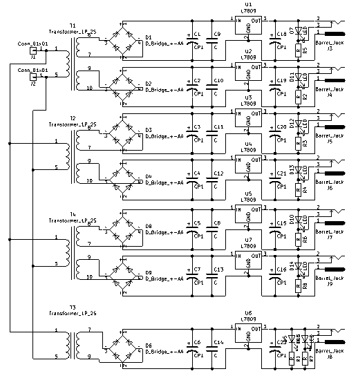 4 трансформатора, 7 выходов. 6 до 100мА (по факту итого меньше, 5-30мА), 1 на стабилизаторе в корпусе ТО 220, до 250мА выход ориентировочно.