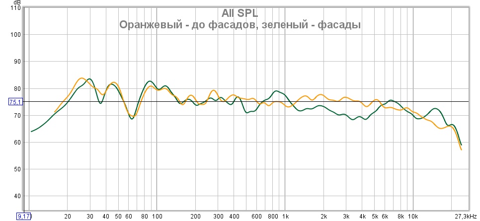 Однако, более всего хочется сравнить с предыдущей ситуацией, чтобы понять влияние моих последних изменений (фасадов). По АЧХ я вижу ослабление некоторых мод. И снова, возросшую неравномерность в средне-высоких. Т.е., по АЧХ было-то лучше получается?