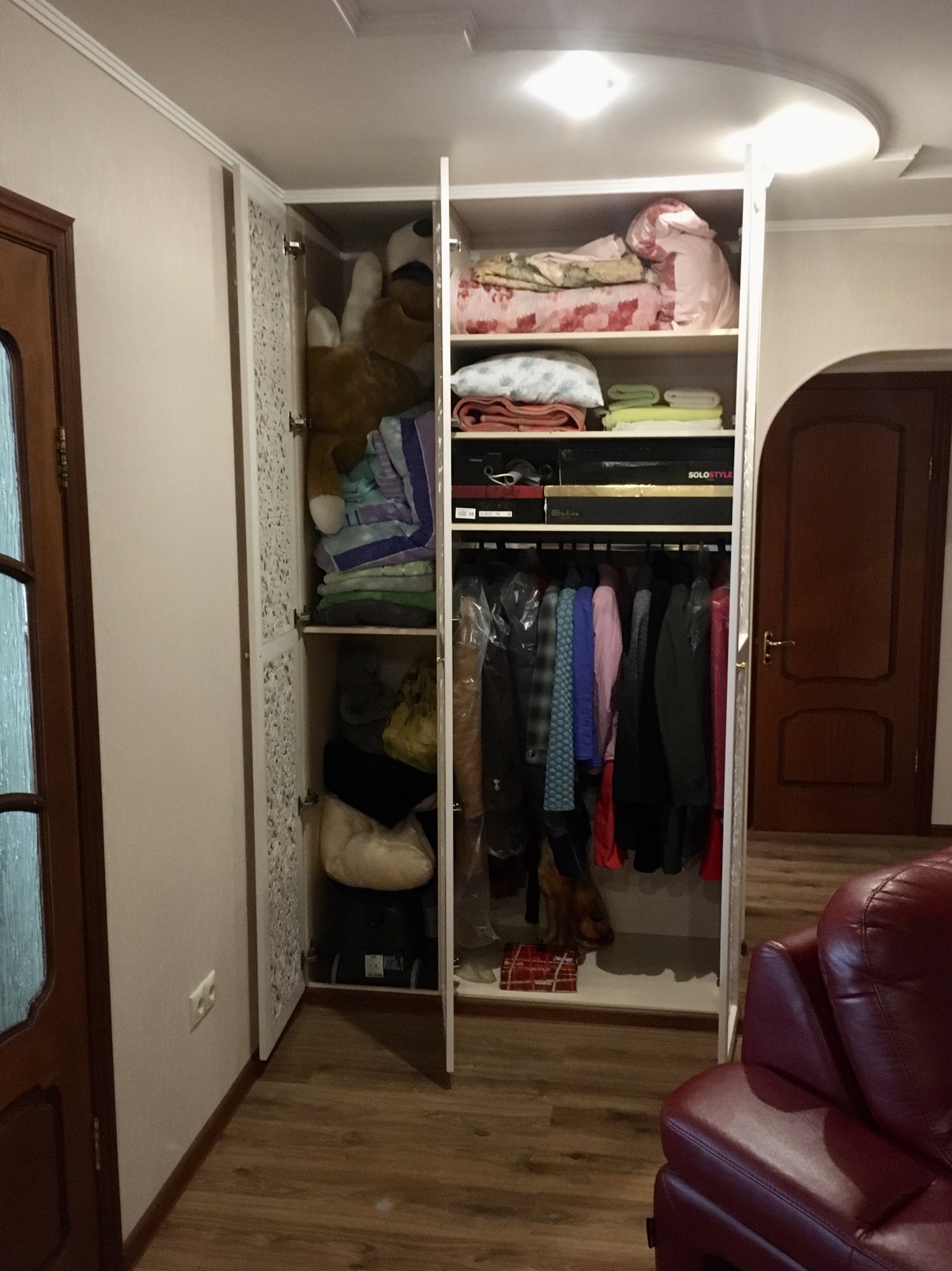Примечание: По окончании последнего эксперимента с наполнением шкафов, вещи были из них изъяты. Шкафы предназначены под наполнение звукопоглотителем и сейчас снова ждут своей учести. Закрыты фасадами, однако в большинстве своем, пусты внутри.