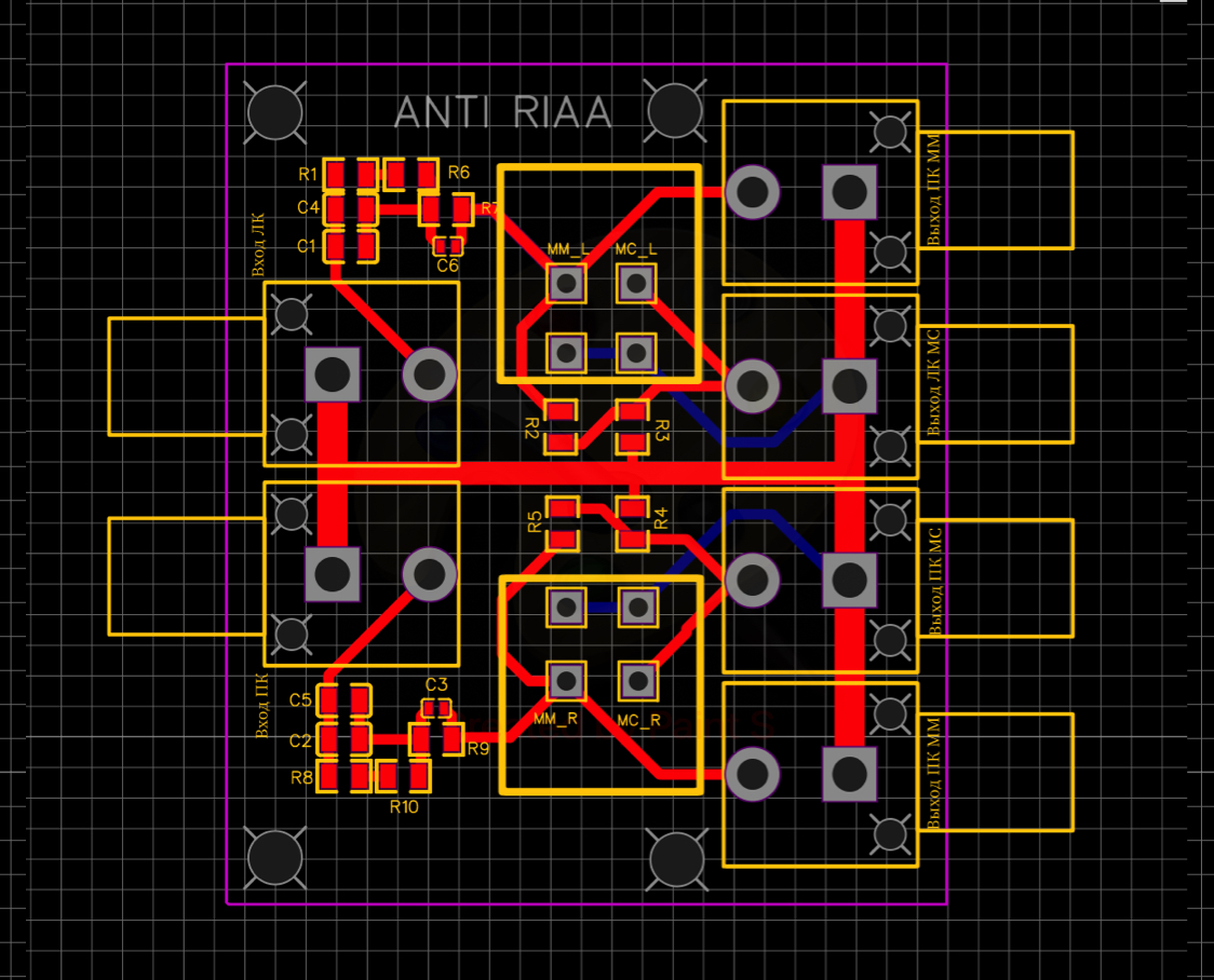 По поводу шелкографии: главное, чтобы обозначения читались хорошо и названия входов/выходов были информативны. Если есть желание, то обозначить детали с суффиксами для правого и левого каналов (R1L, R2L), но это уже будет просто тюнинг.