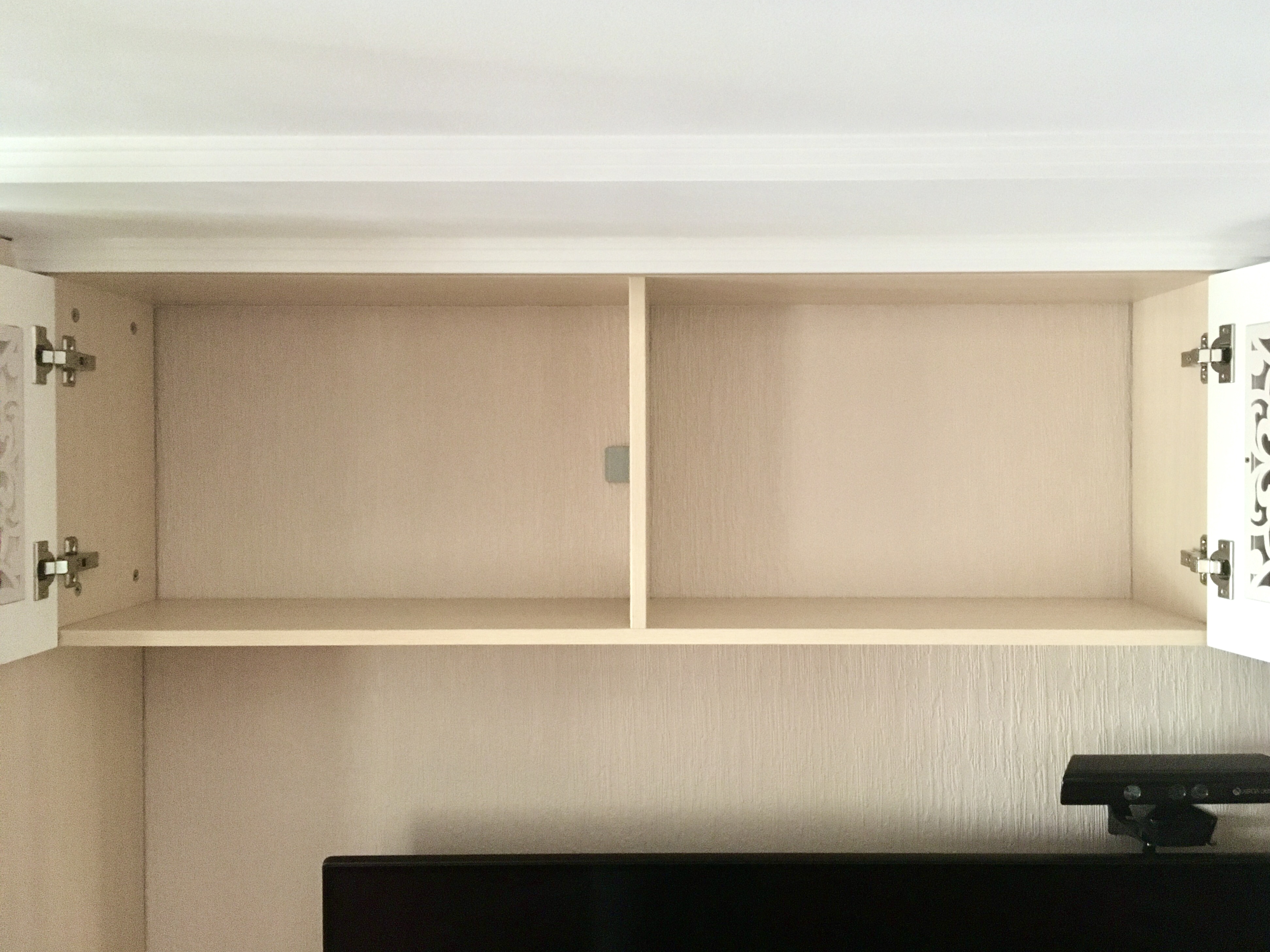 Вот, выбранный мной шкаф - левая фронтальная антресоль. Конструкция внутри должна быть герметичной. Для этого, я проклеил швы клейкой лентой, которую купил вместе со звукопоглотителем. Клеится лента очень хорошо. Даже при повторном наклеивании. И держится крепко на любой поверхности.