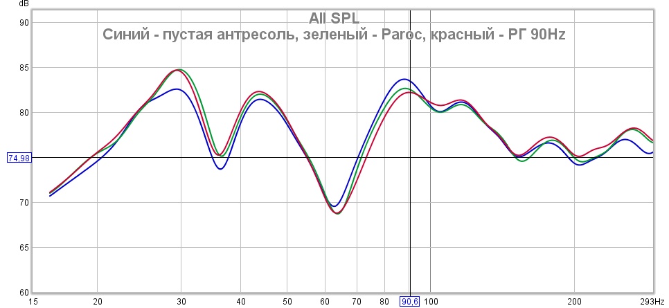Красная линия - это замер до моих занятий с резонаторами Гельмгольца. Синяя - "побочный эффект", после установки резонатора на 90Гц в антресоль. Зеленая - замер с добавленным, описываемым резонатором Гельмгольца.
