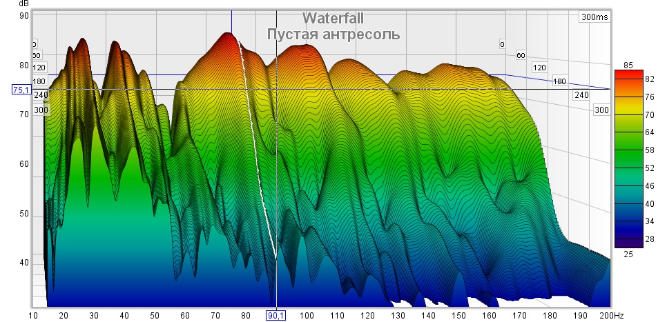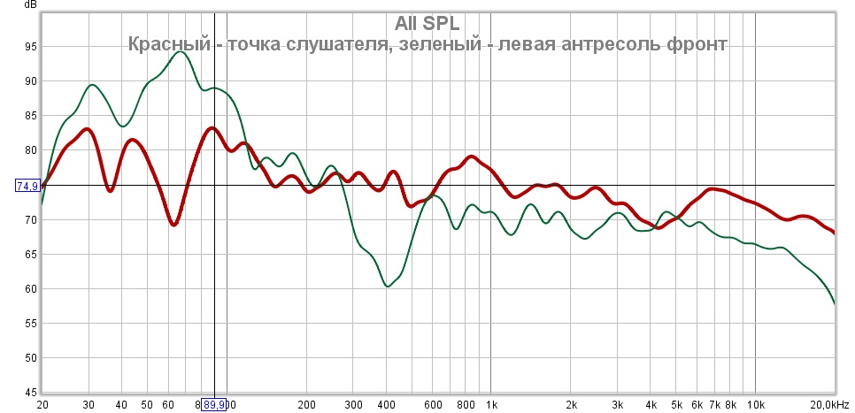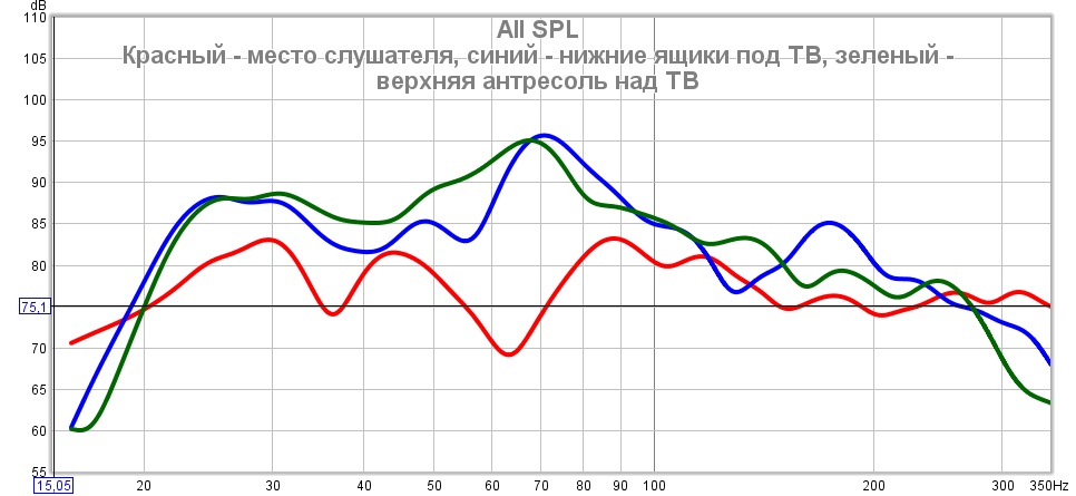 После пересмотра результатов предыдущих "20 измерений", выбор пал на левую фронтальную антресоль. В ее зоне виден прирост на частоте 90 Гц., который наблюдается и в месте прослушивания. Т.е. я выбрал наиболее понятную мне ситуацию для эксперимента. Ибо, я так и не понял, как быть со смещением пиков и провалов на кривой АЧХ, при замере в разных местах. Нелинейность этого я отмечал выше.