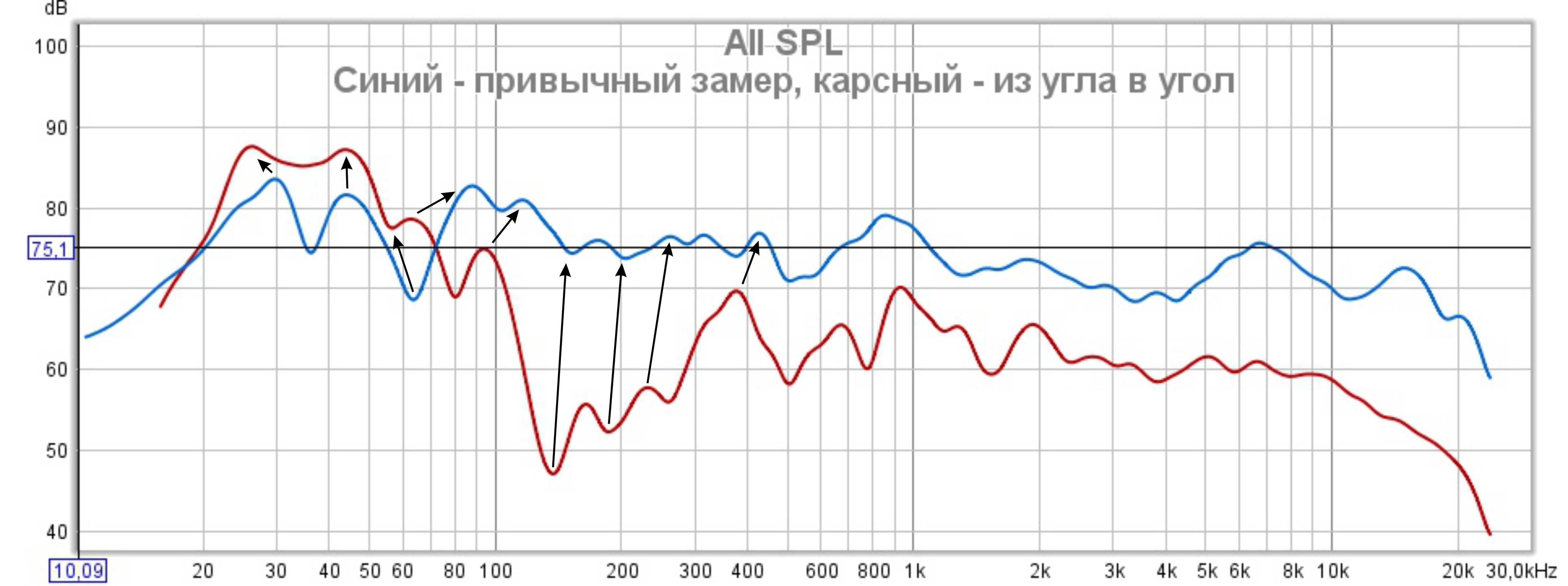 1) Для замера мод "из угла в угол" я выставил микрофон в самый верх левого заднего угла, а колонку поставил в низу правого фронтального угла. После чего выставил уровень 75 dB и провел замер.