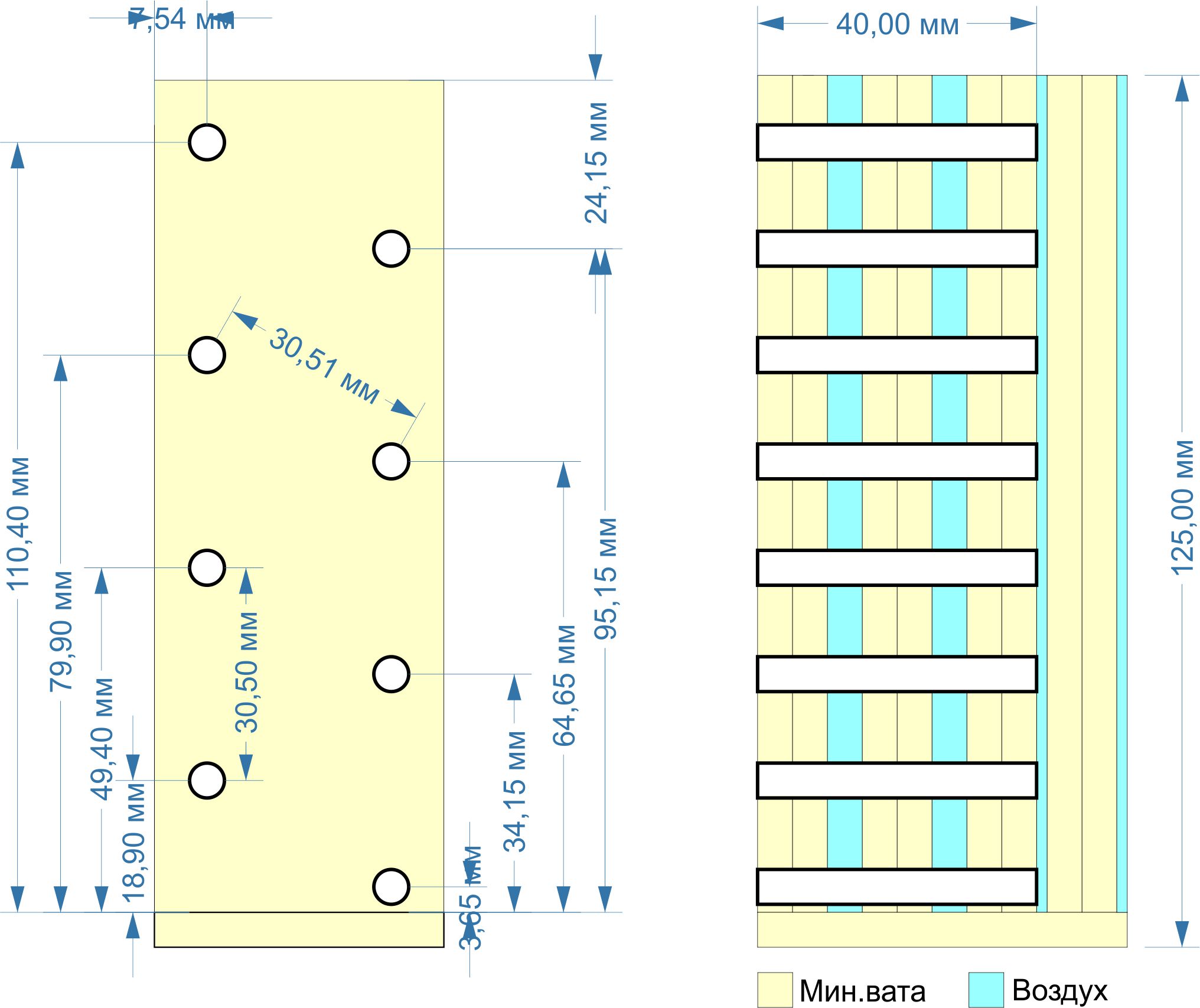 Вроде бы, мне подходит щелевая конструкция резонатора Гельмгольца. Плюс, мне ее проще всего воплотить - мебельщики уже согласились напилить мне планок. В качестве внутреннего звукопоглотителя, все-таки выбрана "каменная вата". К сожалению, у льняного утеплителя и аналогов, очень низкая удельная плотность (20-30 кг/м3 против необходимых 60-100 кг/м3). Второй вопрос - в Саратове льняного утеплителя нет, доставка нужного мне количества превосходит его стоимость.