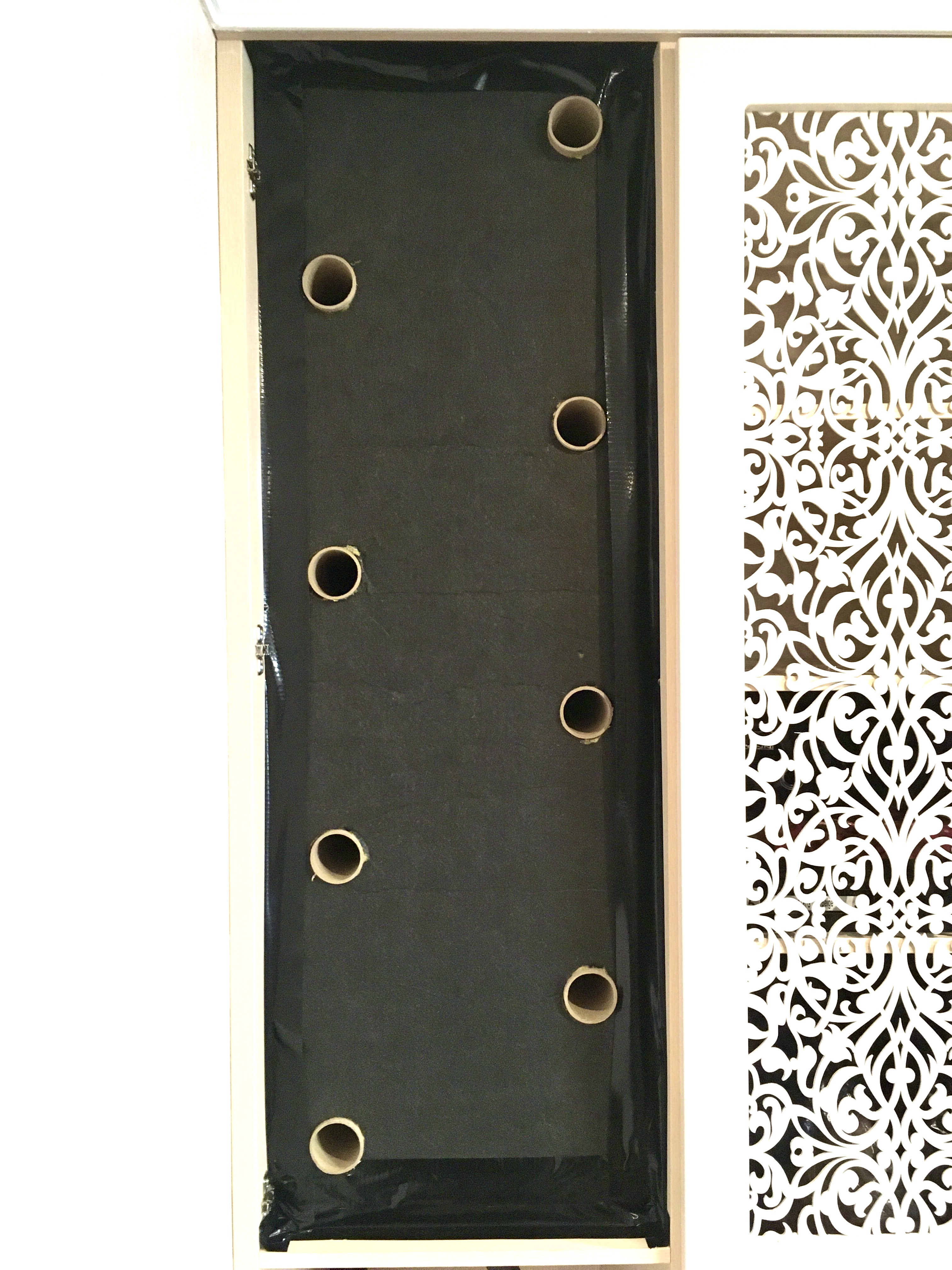 Звукопоглотитель у меня уже установлен в шкафчик. Собрал "планки резонатора", они очень плотно вошли в свои места. Закрепил я их тоже по временной схеме - клейкой лентой. Вроде бы, все тяп-ляп...