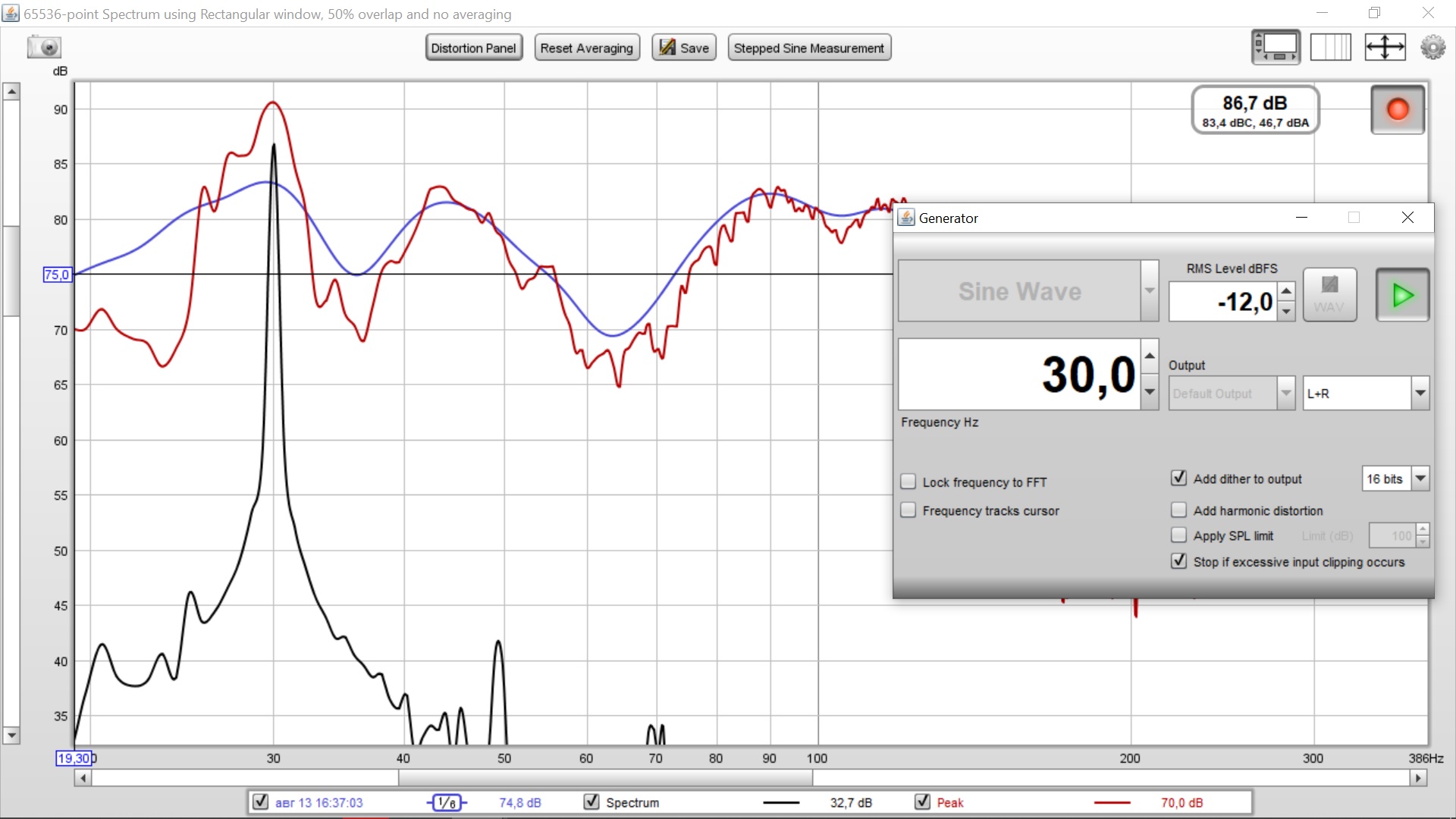 На 30 Гц гудит конкретно. Уши аж закладывает: На 43 Гц тоже не особо приятные ощущения: На 90 Гц вполне терпимо. Таким образом, я делаю вывод, что ту неприятность, что я иной раз ловлю на отдельных музыкальных записях, создает резонанс на 30 Гц.