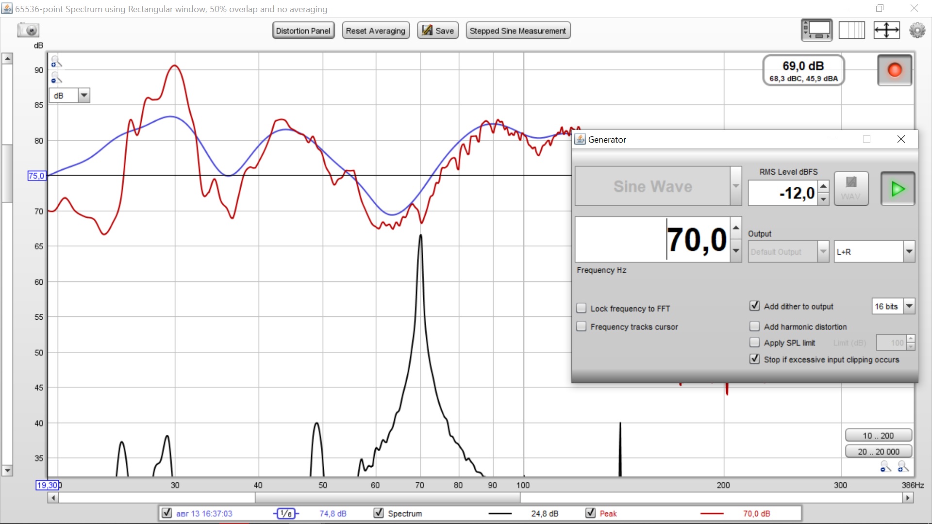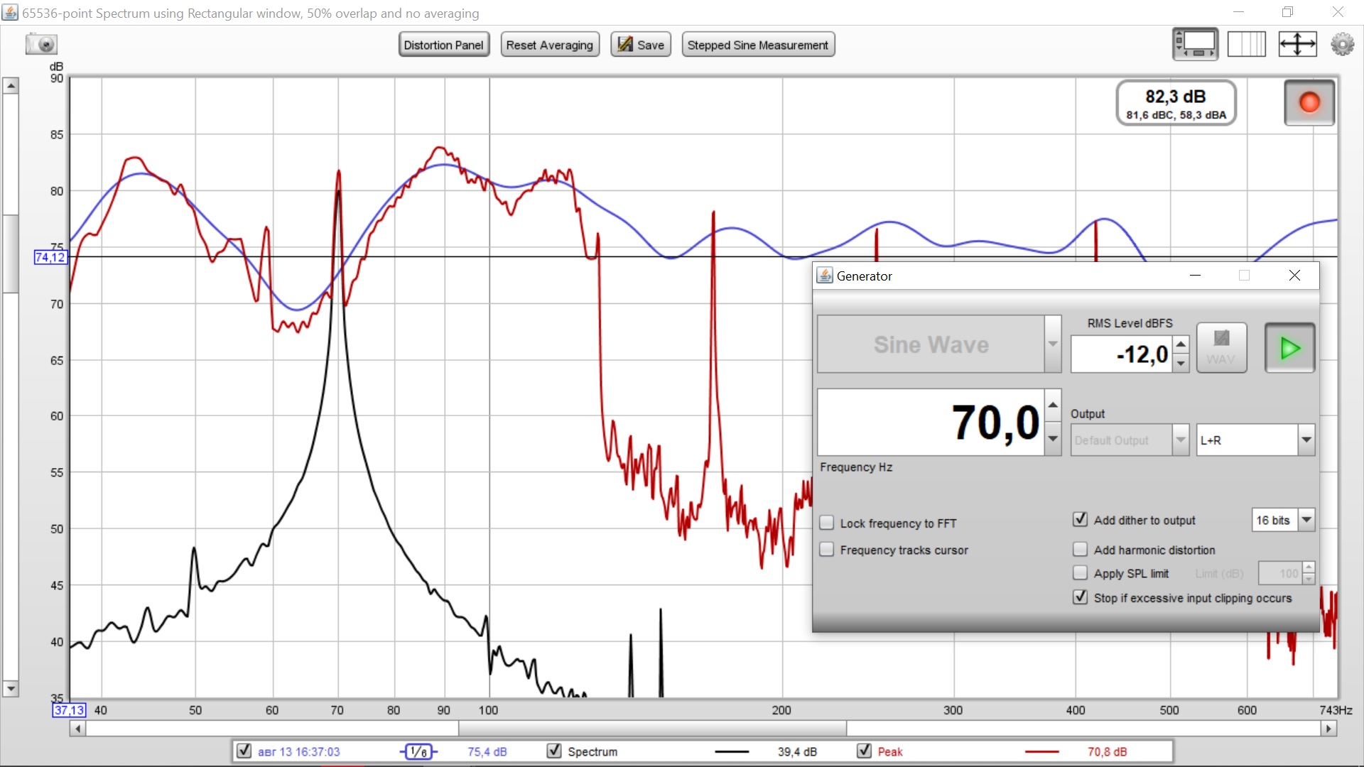 А вот с места слушателя, все не столь эффективно. И реальная частота, похоже получилась 80 Hz. Или что-то близко.