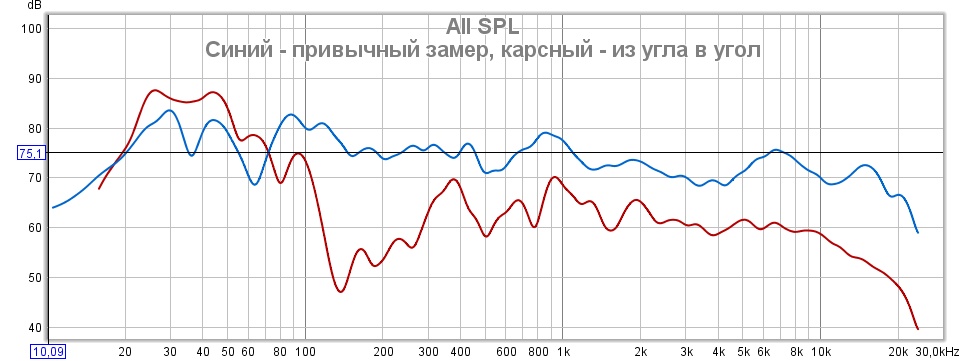 1) Для замера мод "из угла в угол" я выставил микрофон в самый верх левого заднего угла, а колонку поставил в низу правого фронтального угла. После чего выставил уровень 75 dB и провел замер.