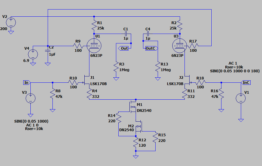 Давайте посмотрим на оригинал. Источник тока подключен к отрицательному напряжению (в оригинале, если не ошибаюсь, -15В относительно сигнальной земли, потенциал которой предполагаем = 0). Сетка лампы каскода поднята относительно земли (потенциал 0) на +6,9В. Для чего это сделано? Источник тока для своей работы требует определённого напряжения, нижний элемент каскода (в нашем случае - LSK170B) требует определённого напряжения, должно обеспечиваться смещение сетка катод верхнего элемента каскода (лампы в нашем случае).