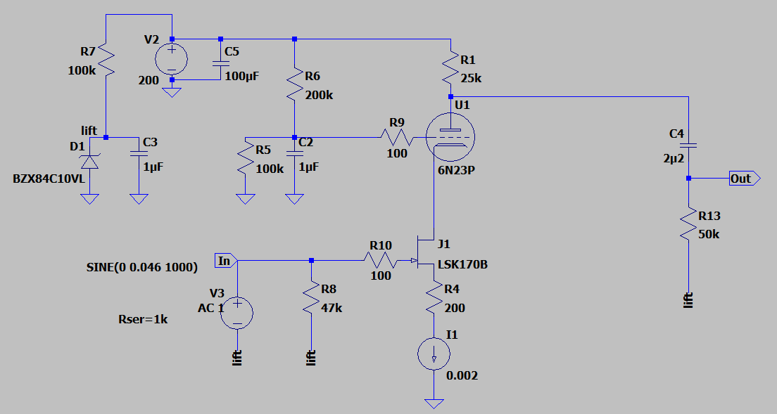 Евгений, я бы с радостью, но я не понимаю, по какому пути Вы пошли. Если Вы моделируете FVP, то схема сильно не совпадает с оригиналом (например, где Вы увидели в FVP источник тока?), да и номиналы деталей тоже (выбранное смещение на лампу просто убьёт JFET). Фактически то, что Вы сделали, соответствует катодному повторителю, только сигнал Вы забираете с анодного резистора, на котором его отродясь не было.