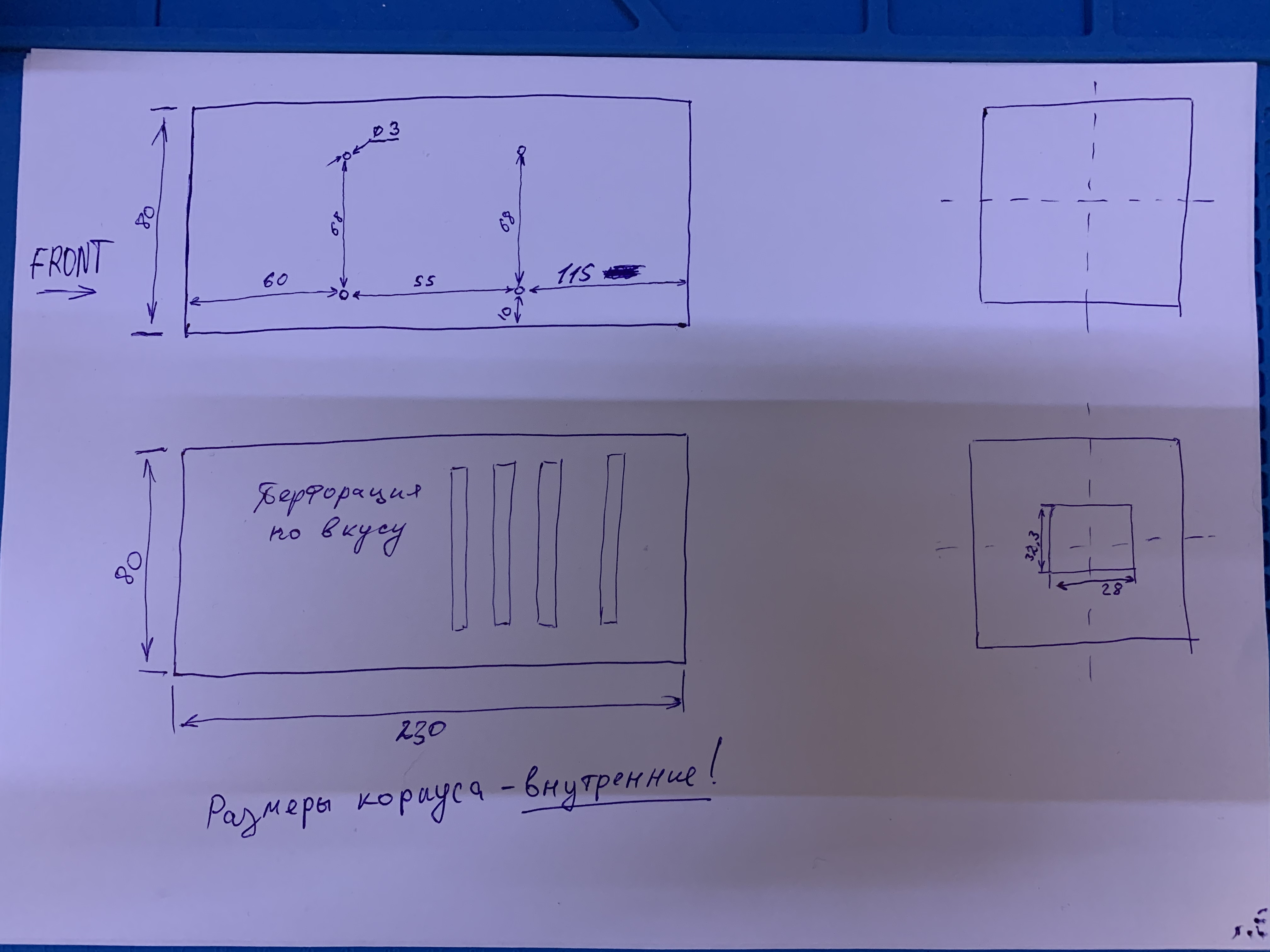 Сзади окно под разьем. Спереди на вскидку я бы сделал тумблер идеально по центру, а диод под ним.