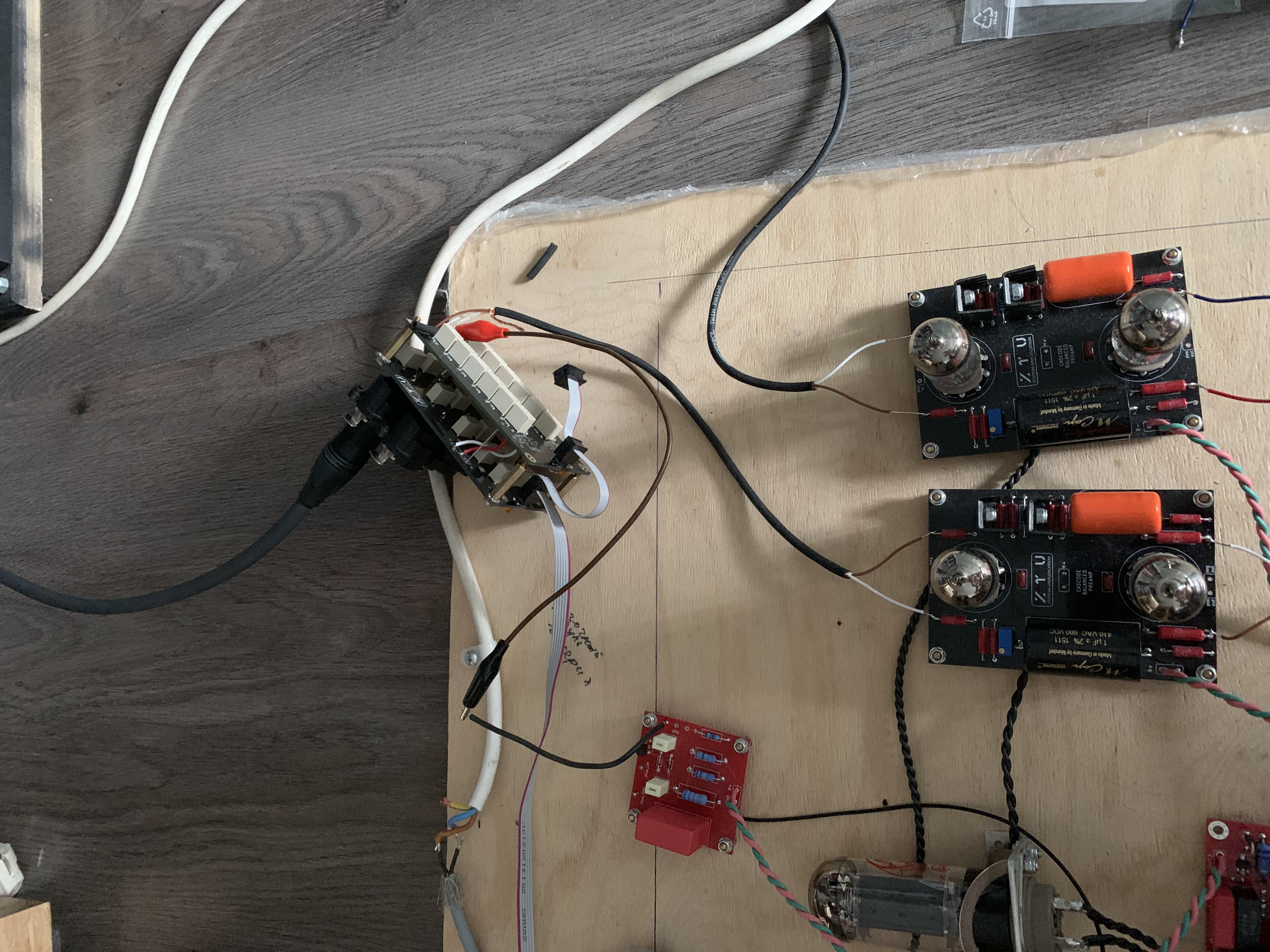 Маленькая красная плата формирует сигнальную землю 10 вольт и земля идет на аттенюатор, там соединена с сетками через резисторы 1 мег