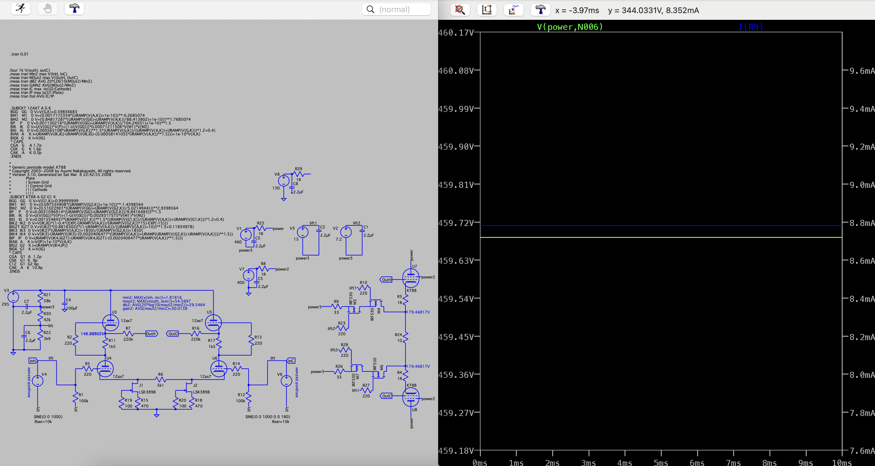 Пока для оценки напряжений я оставил конденсаторы на выходе драйверного каскада, хотел понять распределение напряжений на выходных лампах.